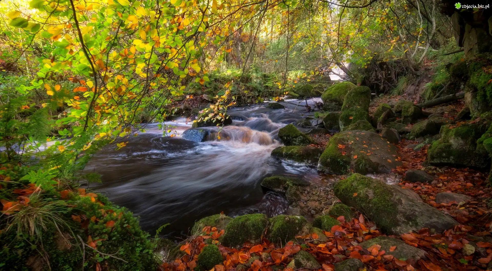Zdjęcie Las, Rzeka, Omszałe, Kamienie, Liście