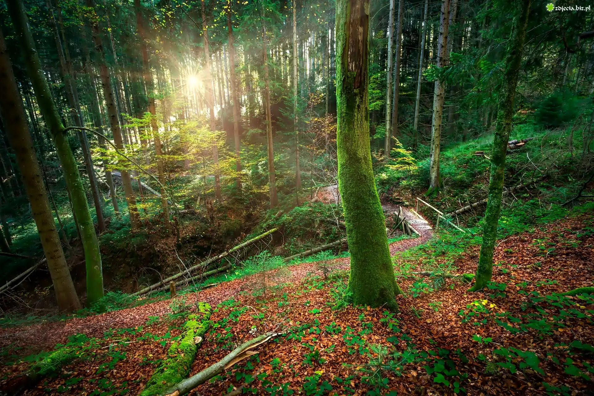 Zdjęcie Las, Promienie, Słońca, Kładka, Ścieżka
