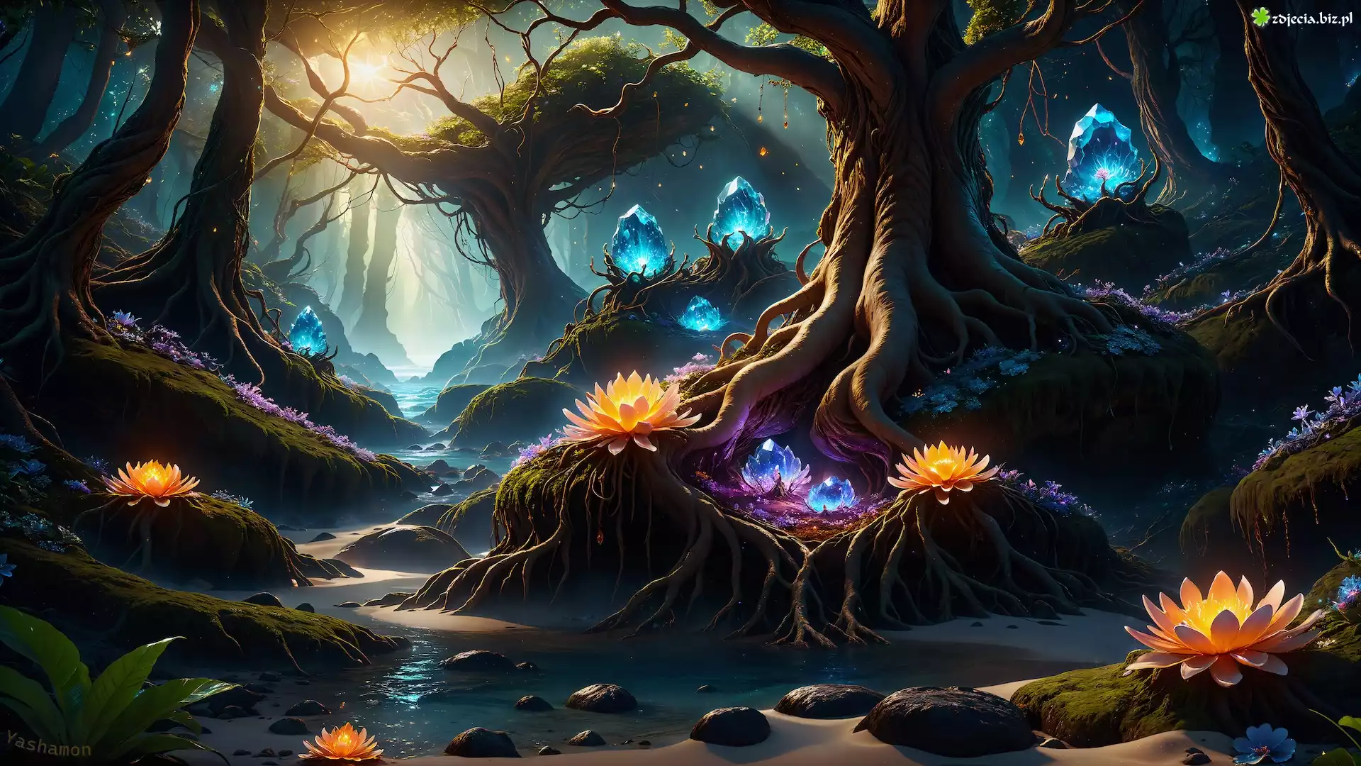 Zdjęcie Grafika, Drzewa, Kwiaty, Lilie wodne, Przebijające światło, Las