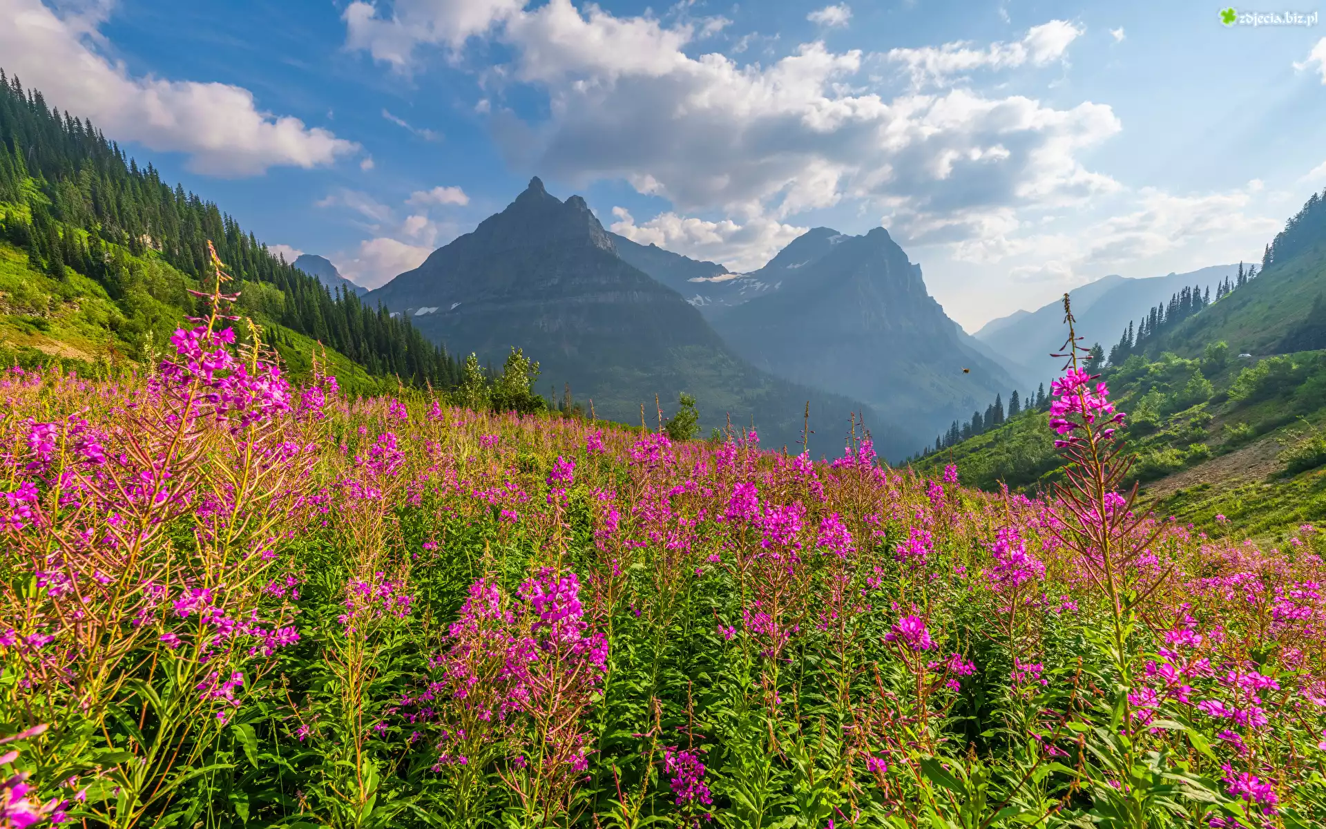 Zdjęcie Stany Zjednoczone, Montana, Park Narodowy Glacier, Góry, Las, Drzewa, Polana, Łąka, Kwiaty, Wierzbówka kiprzyca, Chmury |