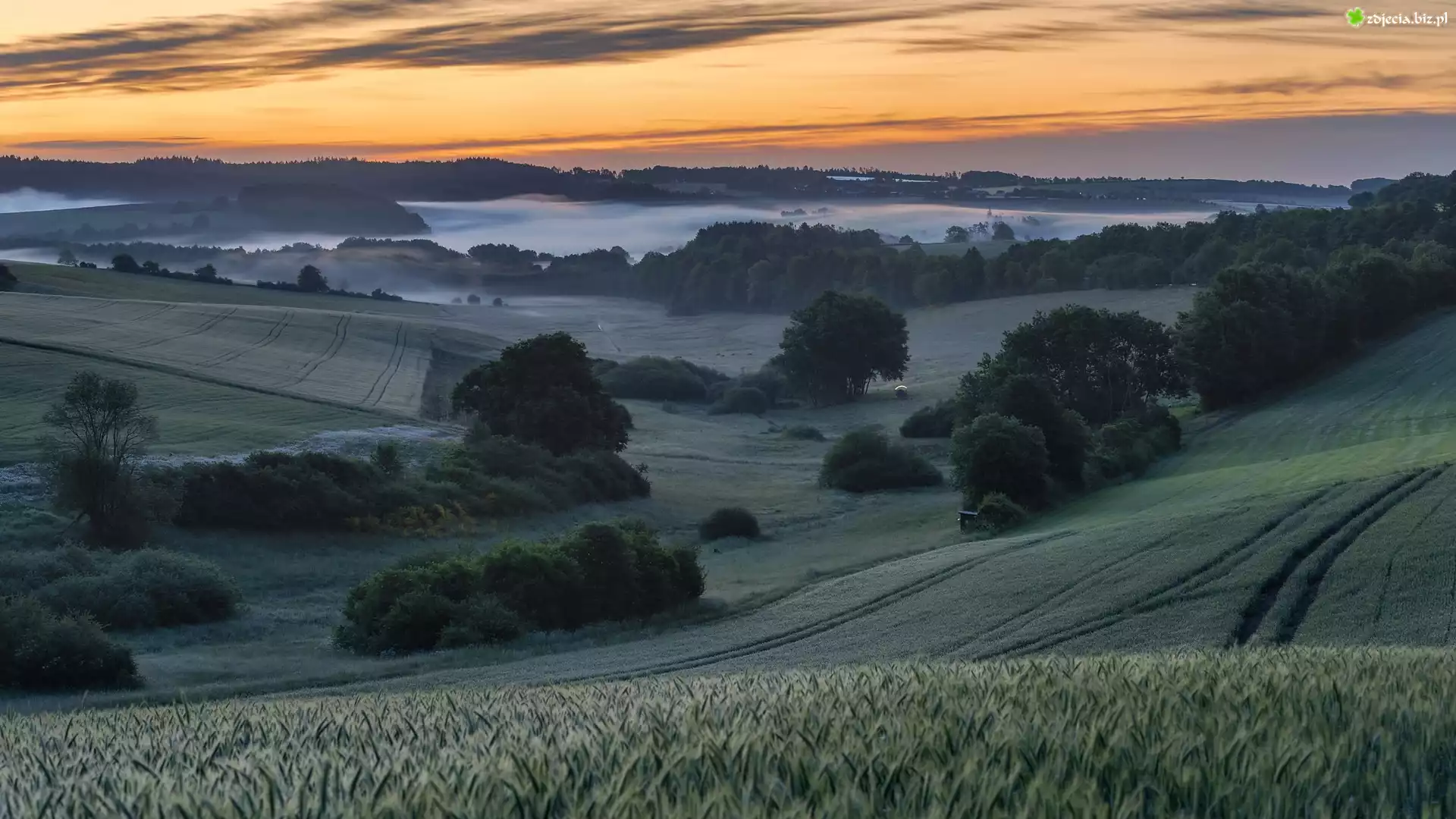 Zdjęcie Zachód słońca, Łąka, Las, Pole, Drzewa, Mgła