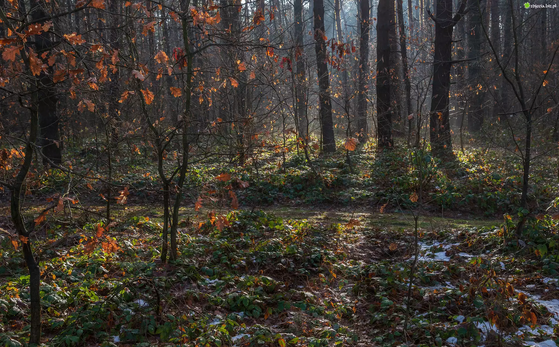 Zdjęcie Las, Drzewa, Brązowe, Liście, Jesień