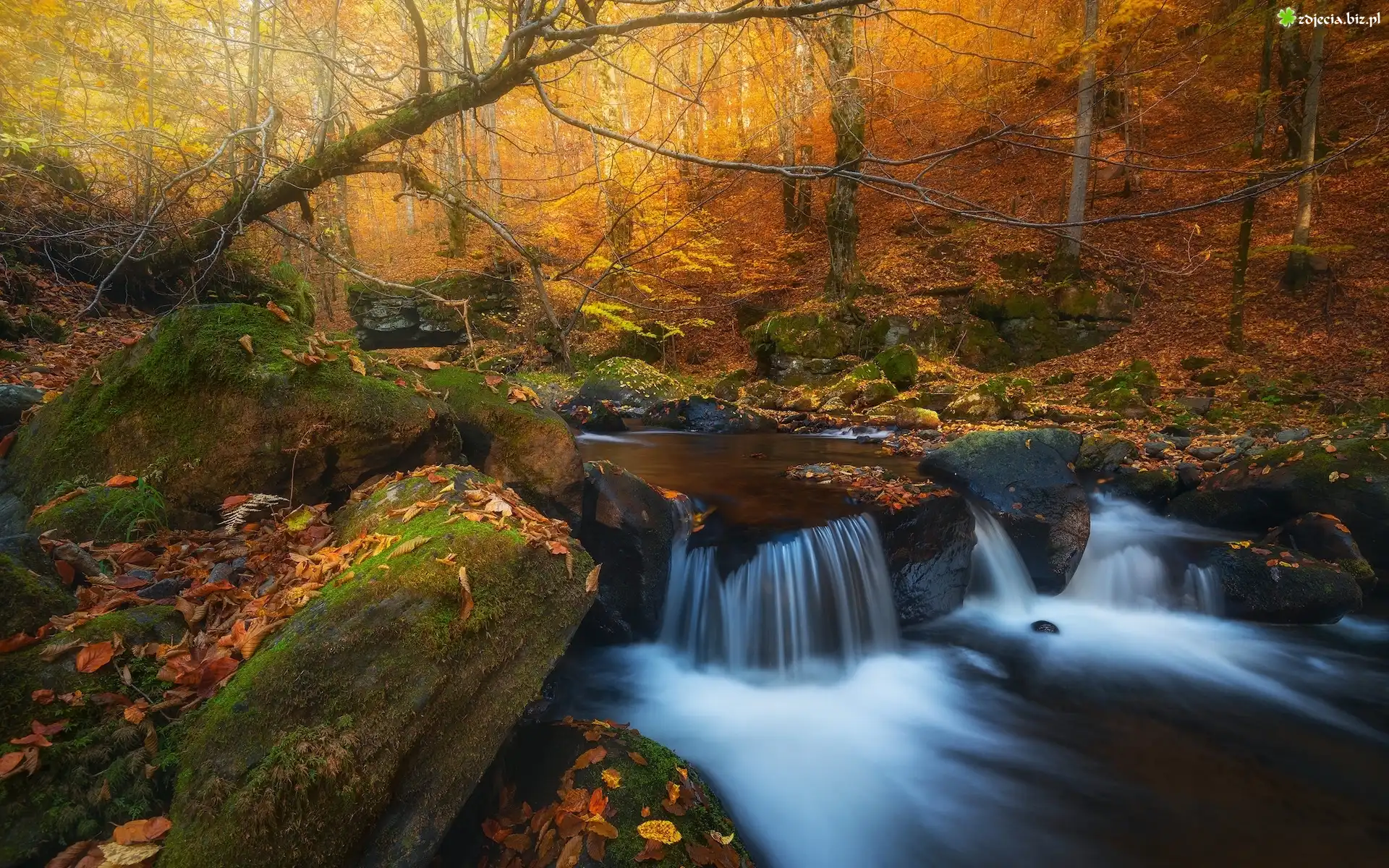 Zdjęcie Jesień, Las, Drzewa, Potok, Rzeka, Kamienie, Opadłe, Liście
