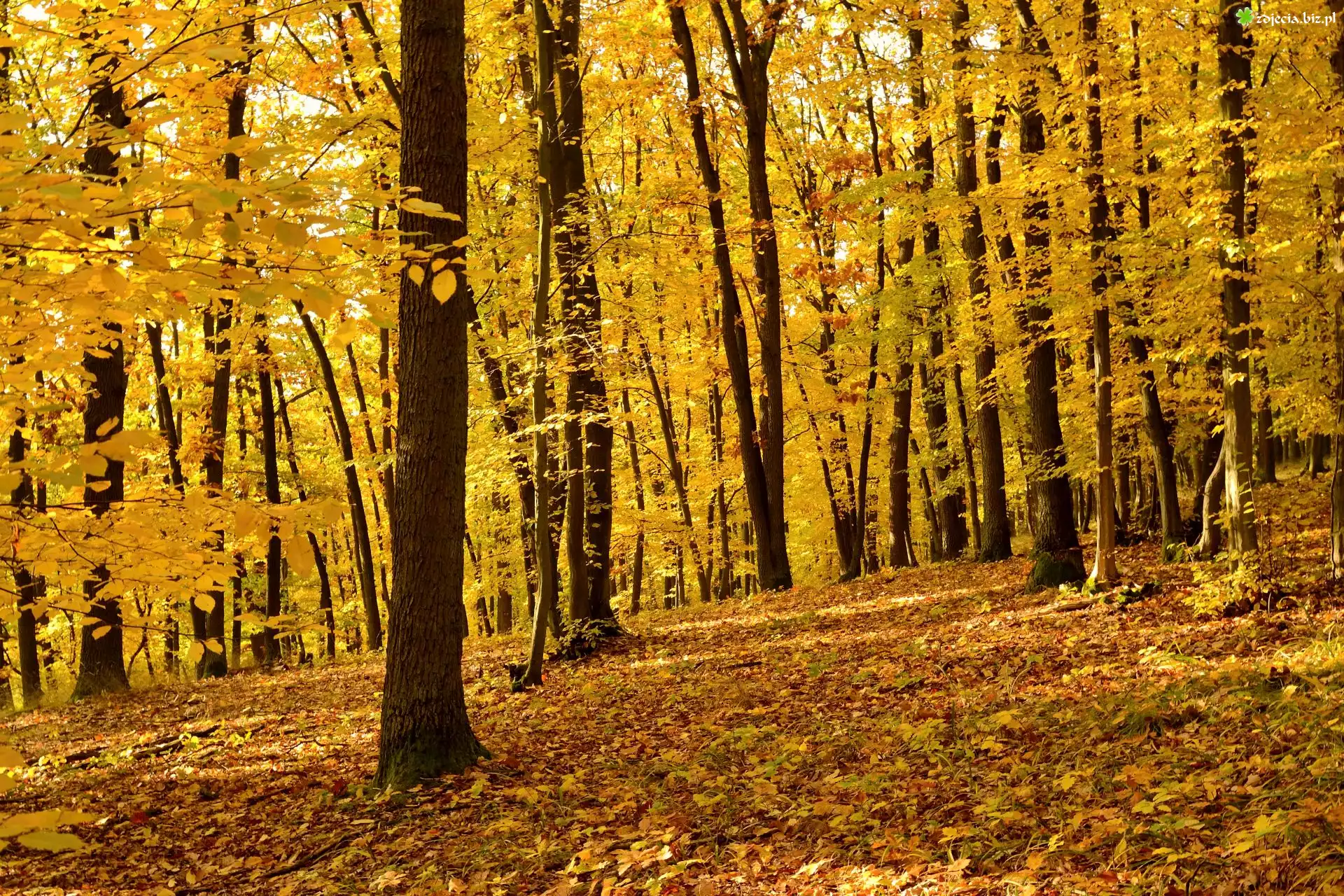 Zdjęcie Las, Drzewa, Opadłe, Pożółkłe, Liście, Jesień