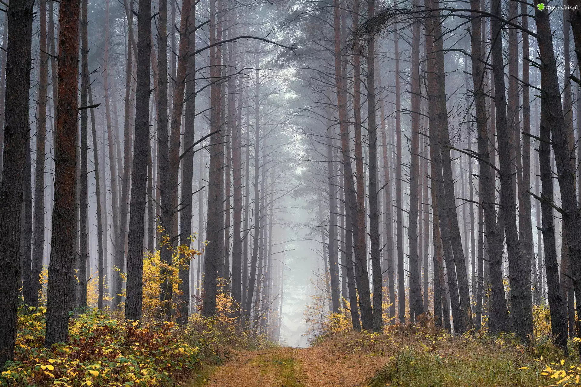 Zdjęcie Las, Drzewa, Droga, Mgła, Rośliny