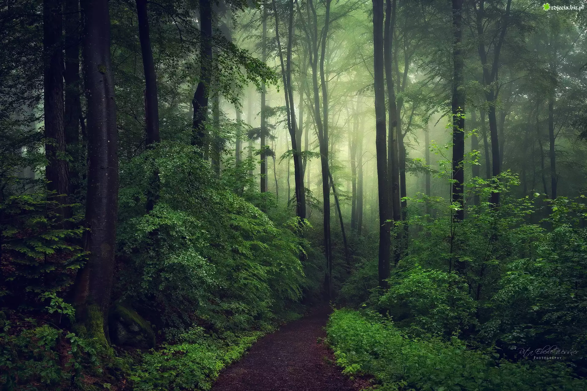 Zdjęcie Las, Zielone, Drzewa, Krzewy, Mgła, Ścieżka