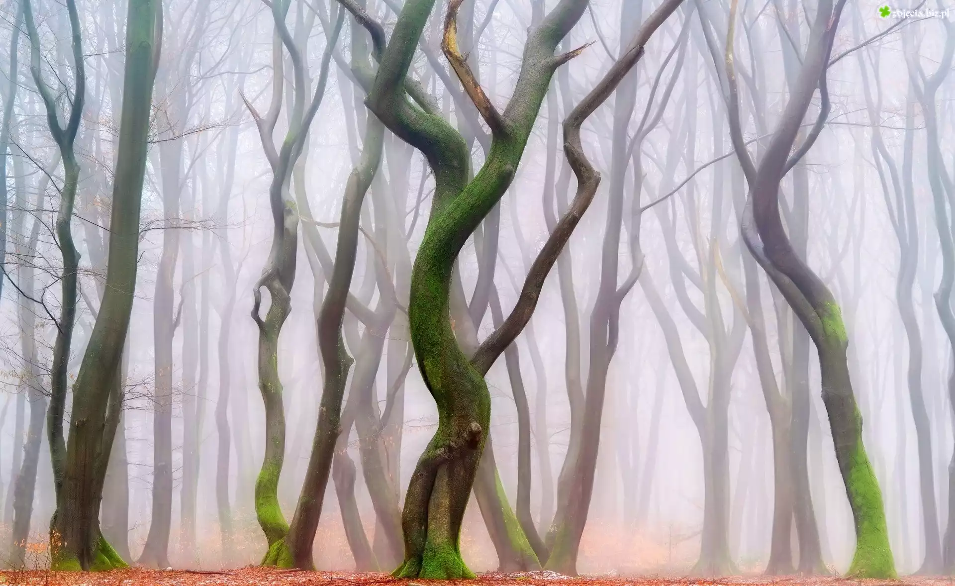 Zdjęcie Las, Wygięte, Drzewa, Mgła, Jesień