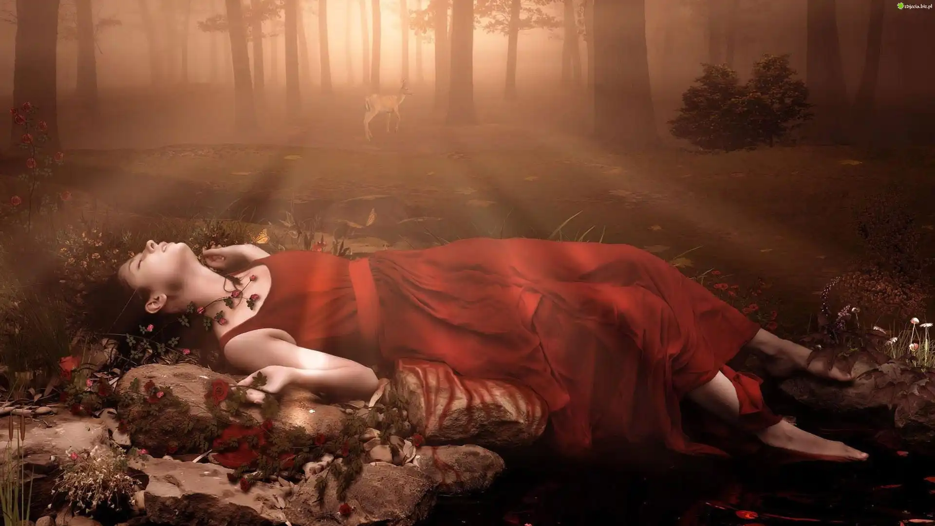 Zdjęcie Las, Dziewczyna, Mgła, Jeleń