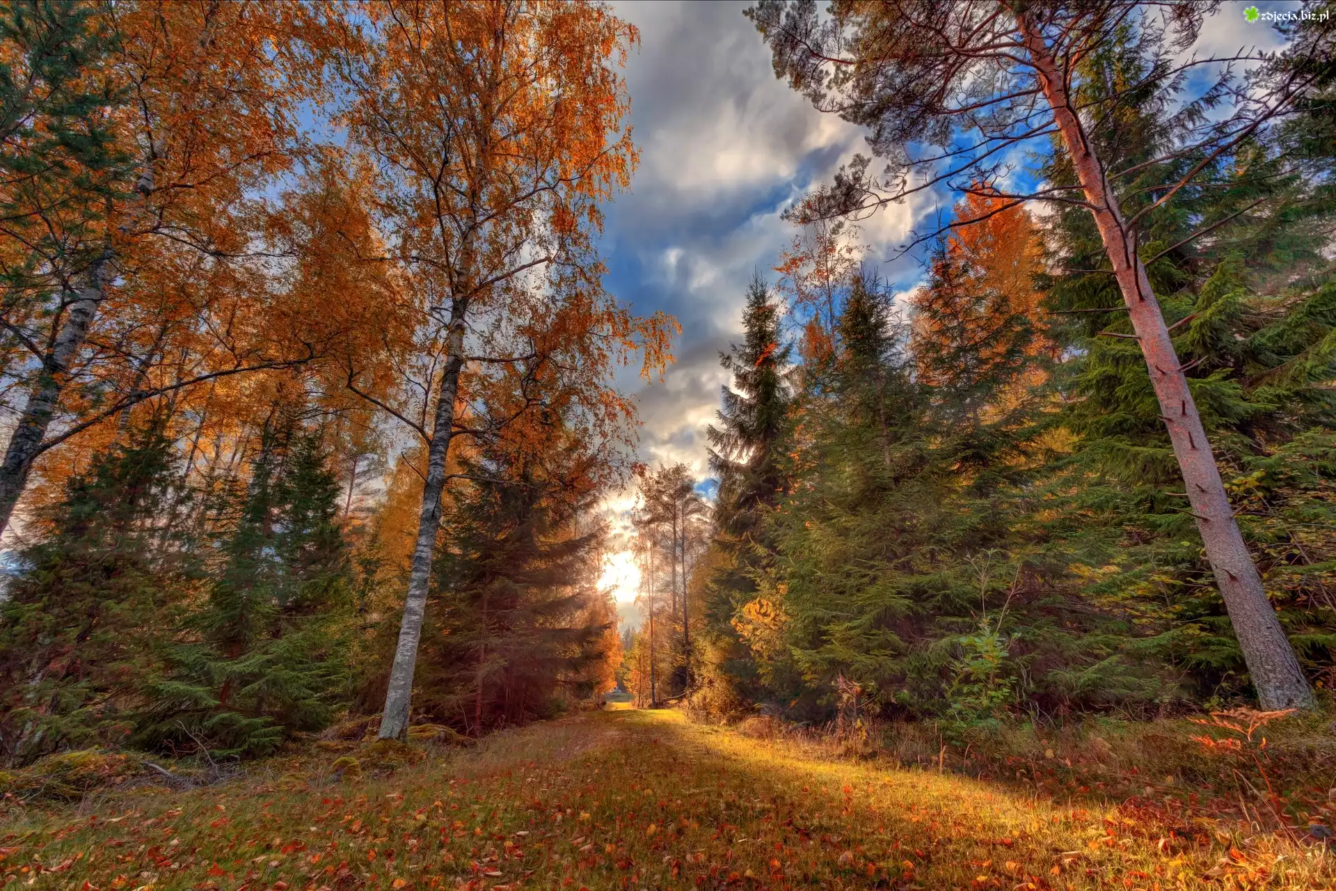 Zdjęcie Las, Drzewa, Polana, Niebo, Jesień