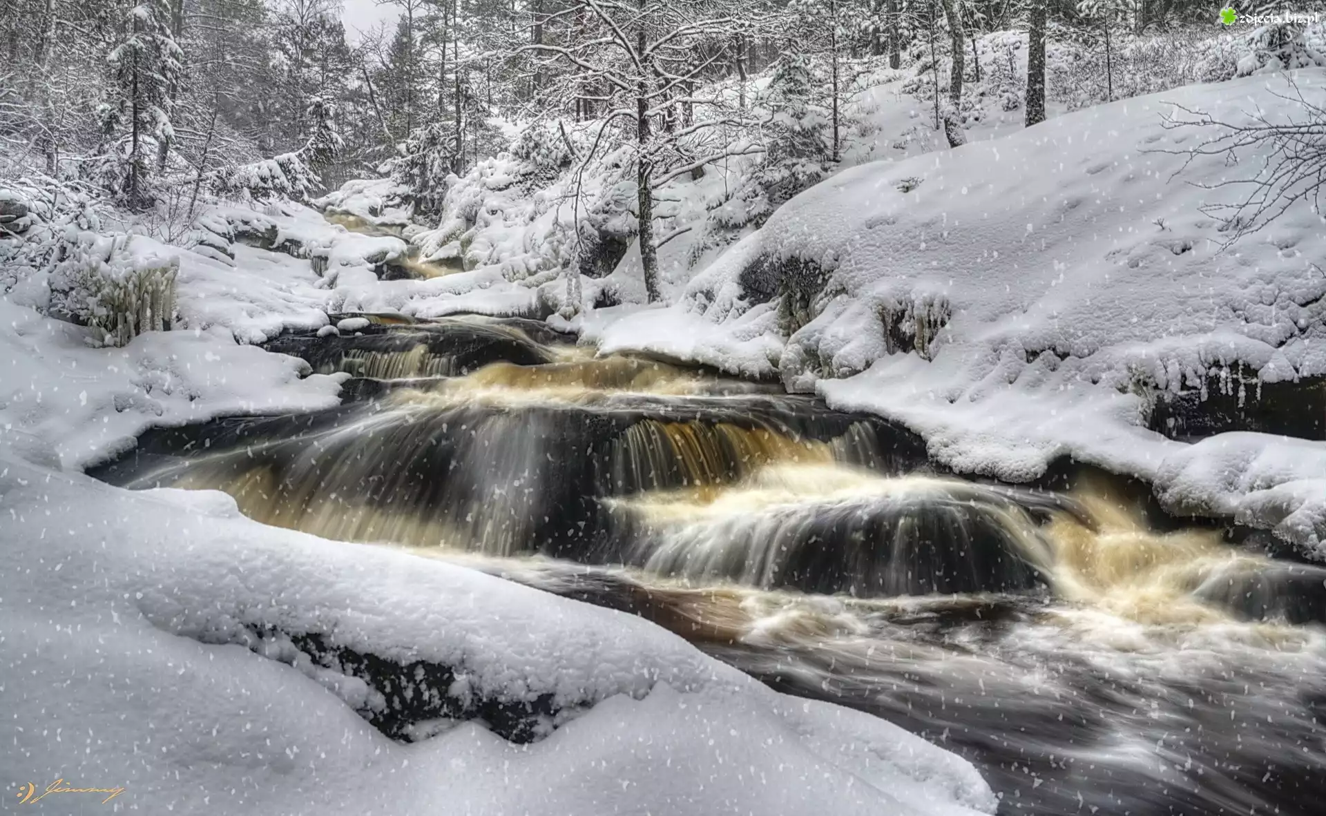 Zdjęcie, Las, Rzeka, Kaskady, Wody, Śnieg, Zima