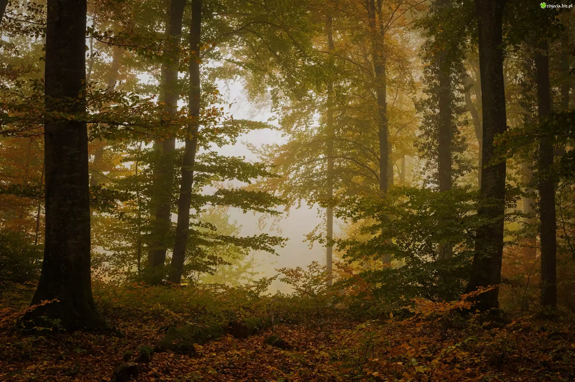 Zdjęcie Las, Mgła, Opadłe, Liście