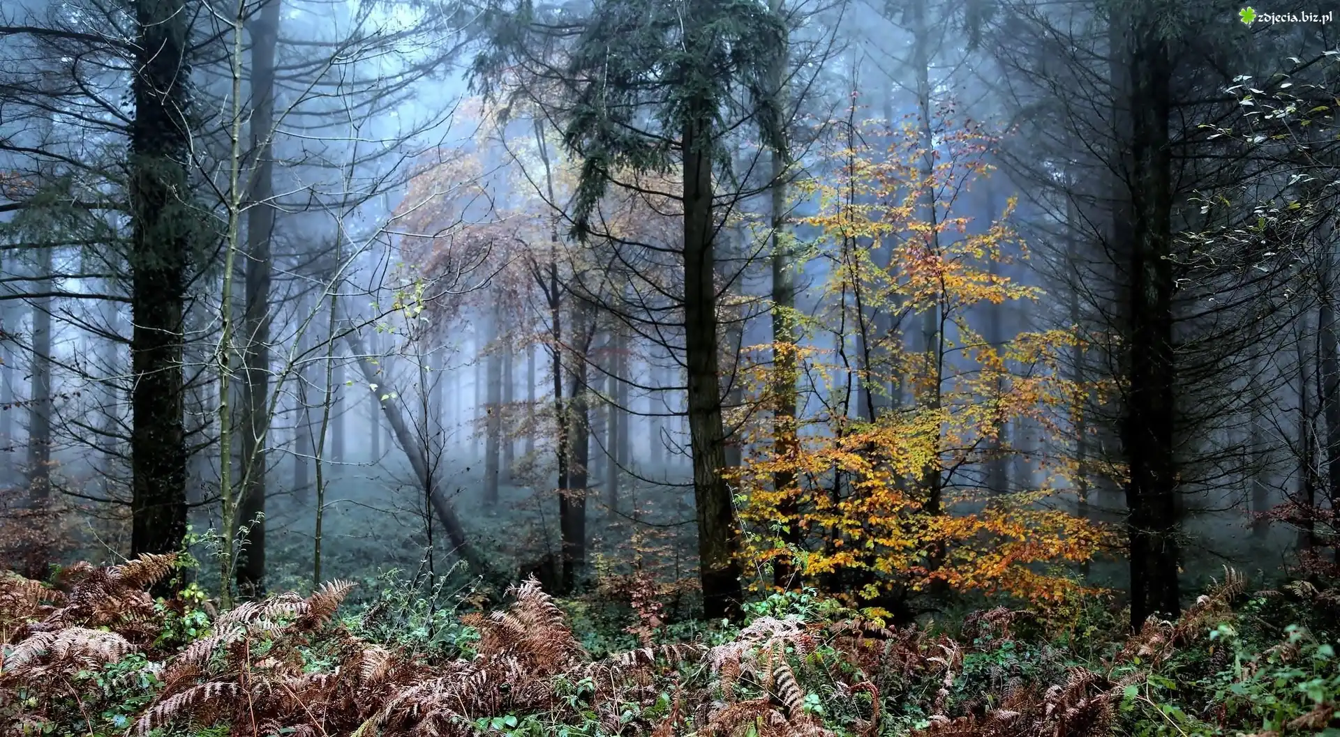 Zdjęcie Las, Drzewa, Mgła, Paprocie, Jesień