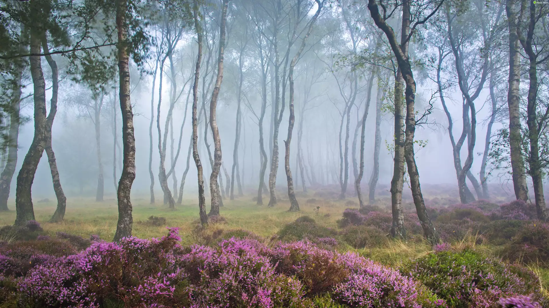 Zdjęcie Anglia, Park Narodowy Peak District, Stanton Moor, Drzewa, Brzozy, Las, Mgła, Polana, Wrzosy, Wrzosowisko |