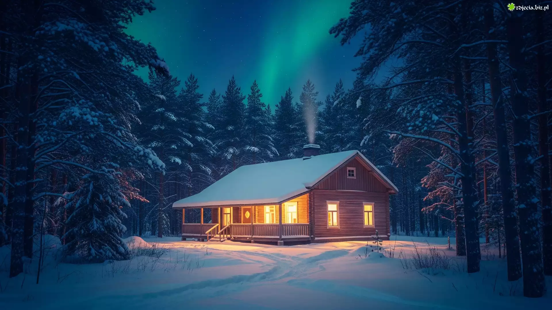 Zdjęcie Zima, Dom, Drzewa, Las, Zorza polarna