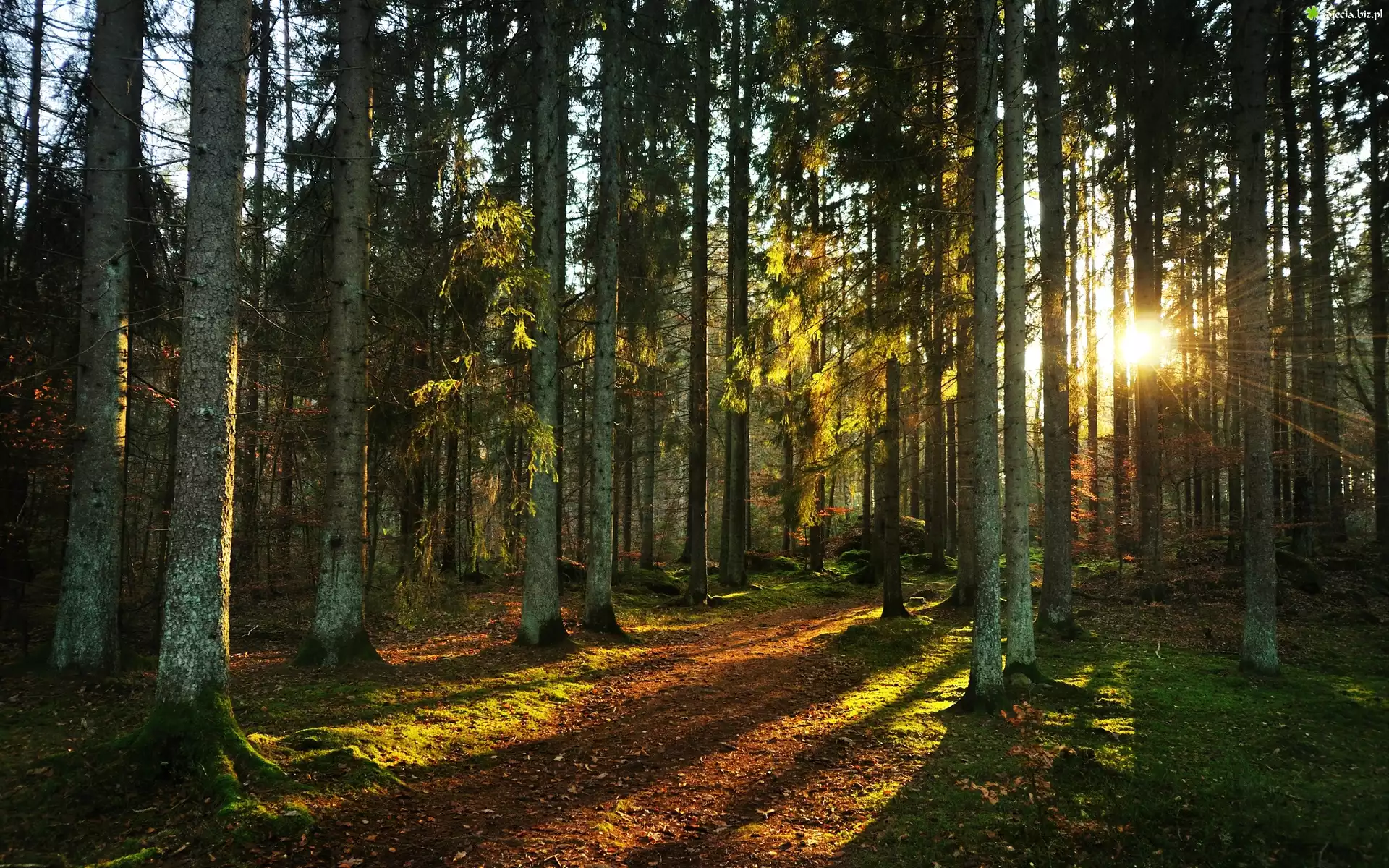 Zdjęcie Las, Ścieżka, Drzewa, Liście, Promienie, Słońca