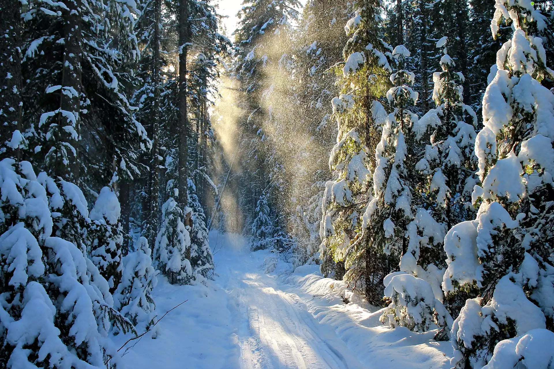 Zdjęcie Las, Droga, Drzewa, Śnieg,Promienie, Słońca