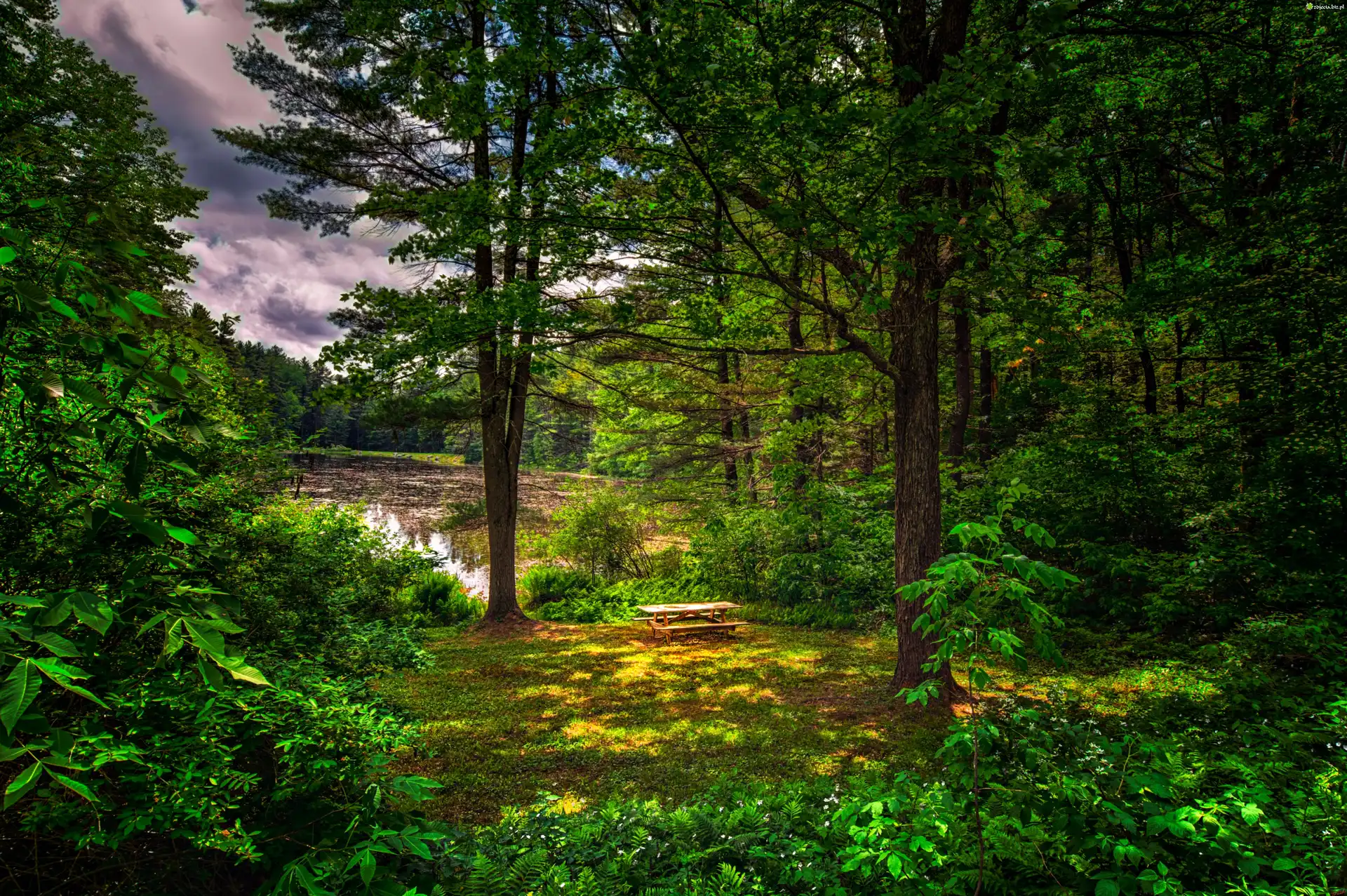 Zdjęcie Las, Staw, Ławka, Przebijające Światło