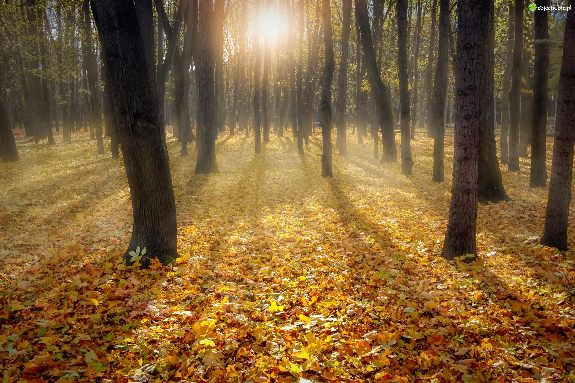 Zdjęcie Las, Liście, Drzewa, Jesień, Przebijające światło
