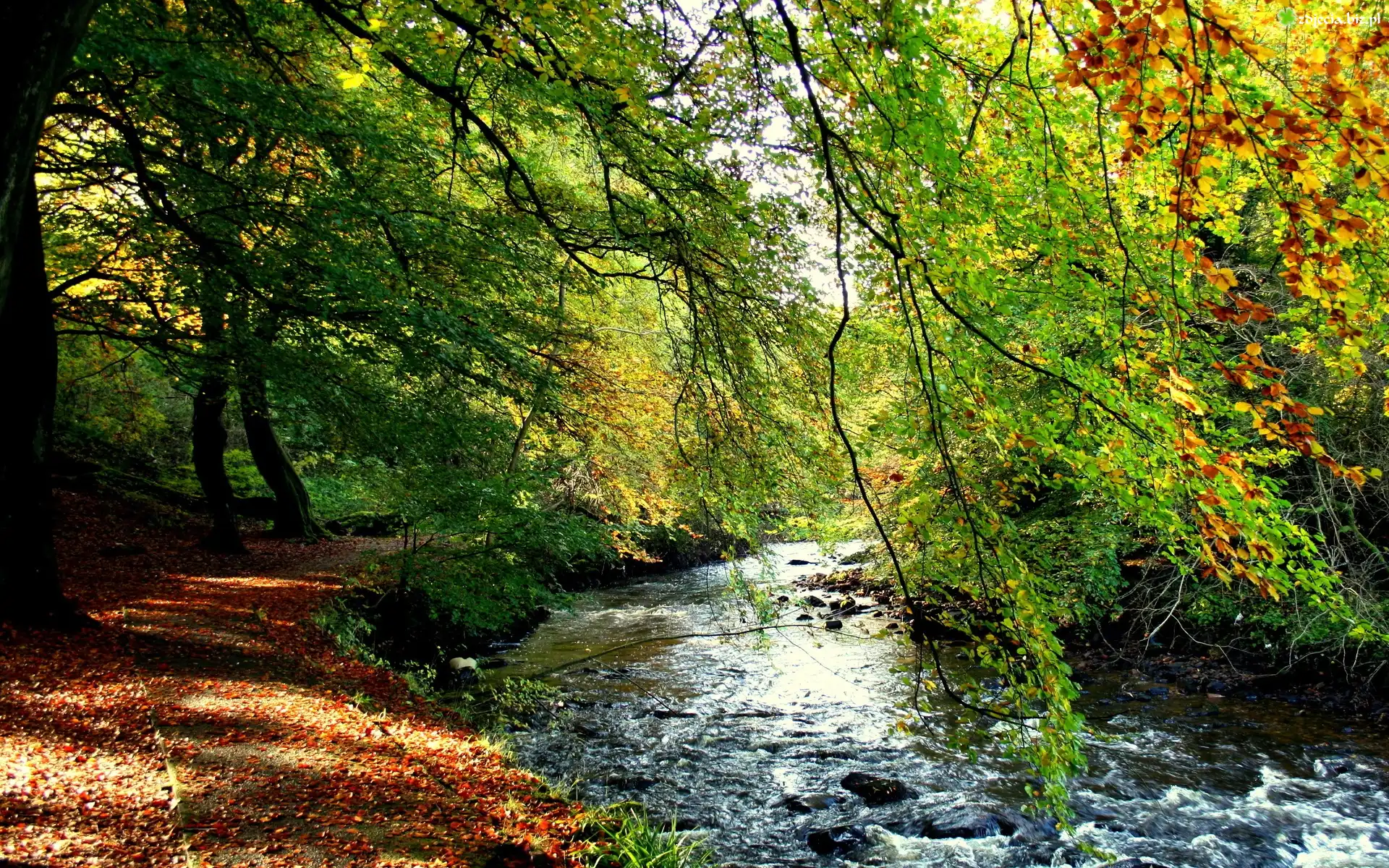 Zdjęcie Rzeka, Las, Liście, Ścieżka, Przebijające, Światło, Jesień