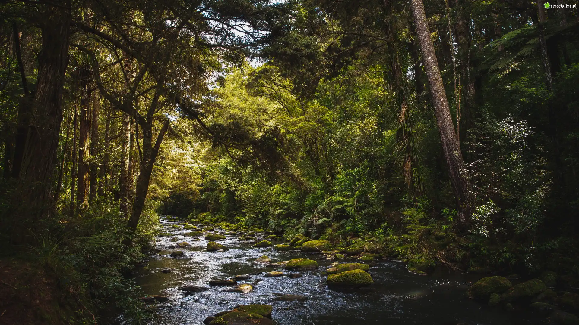 Zdjęcie Las, Drzewa, Krzewy, Rzeka, Kamienie