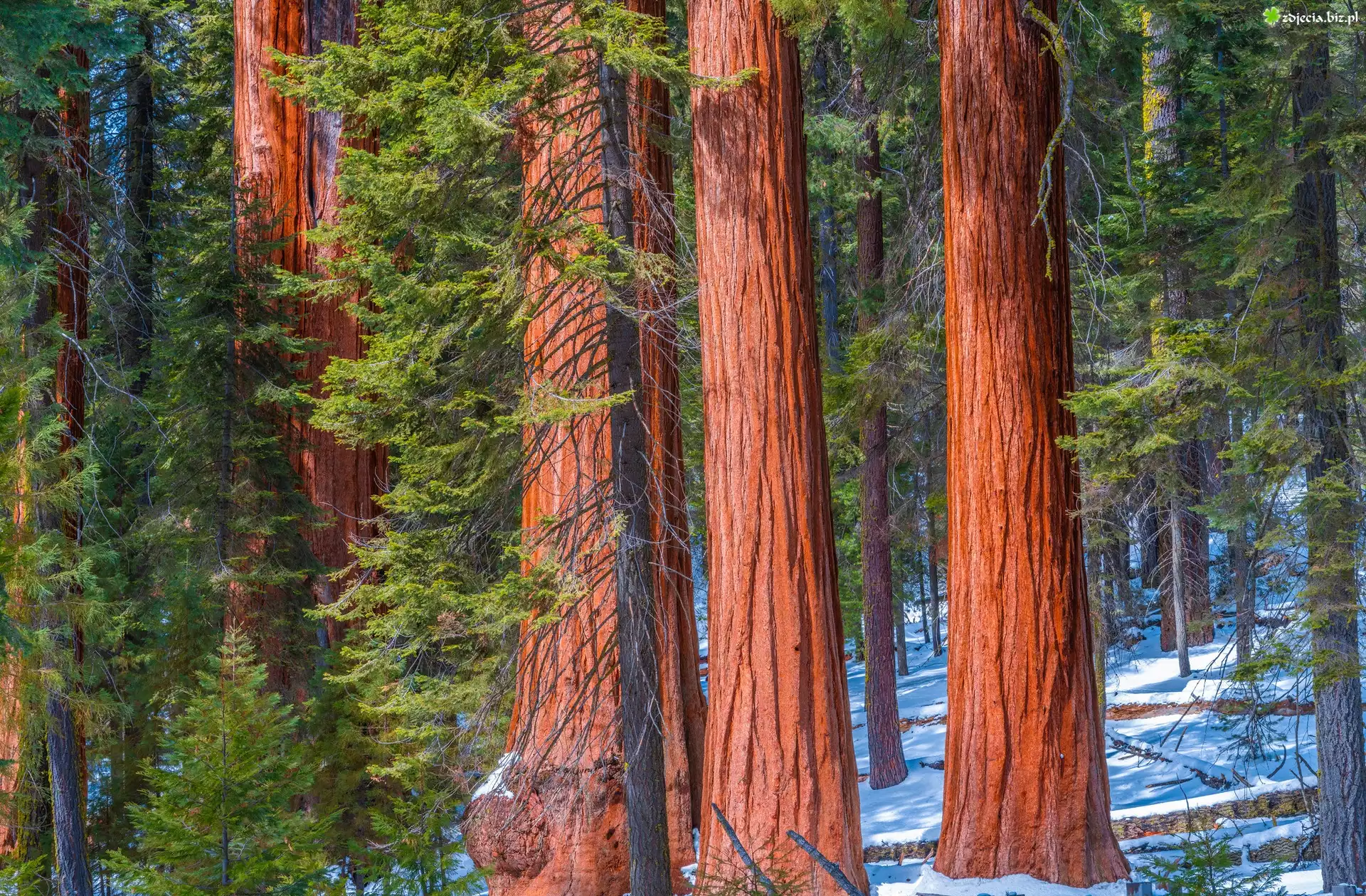 Zdjęcie Las, Śnieg, Drzewa, Sekwoje, Pnie