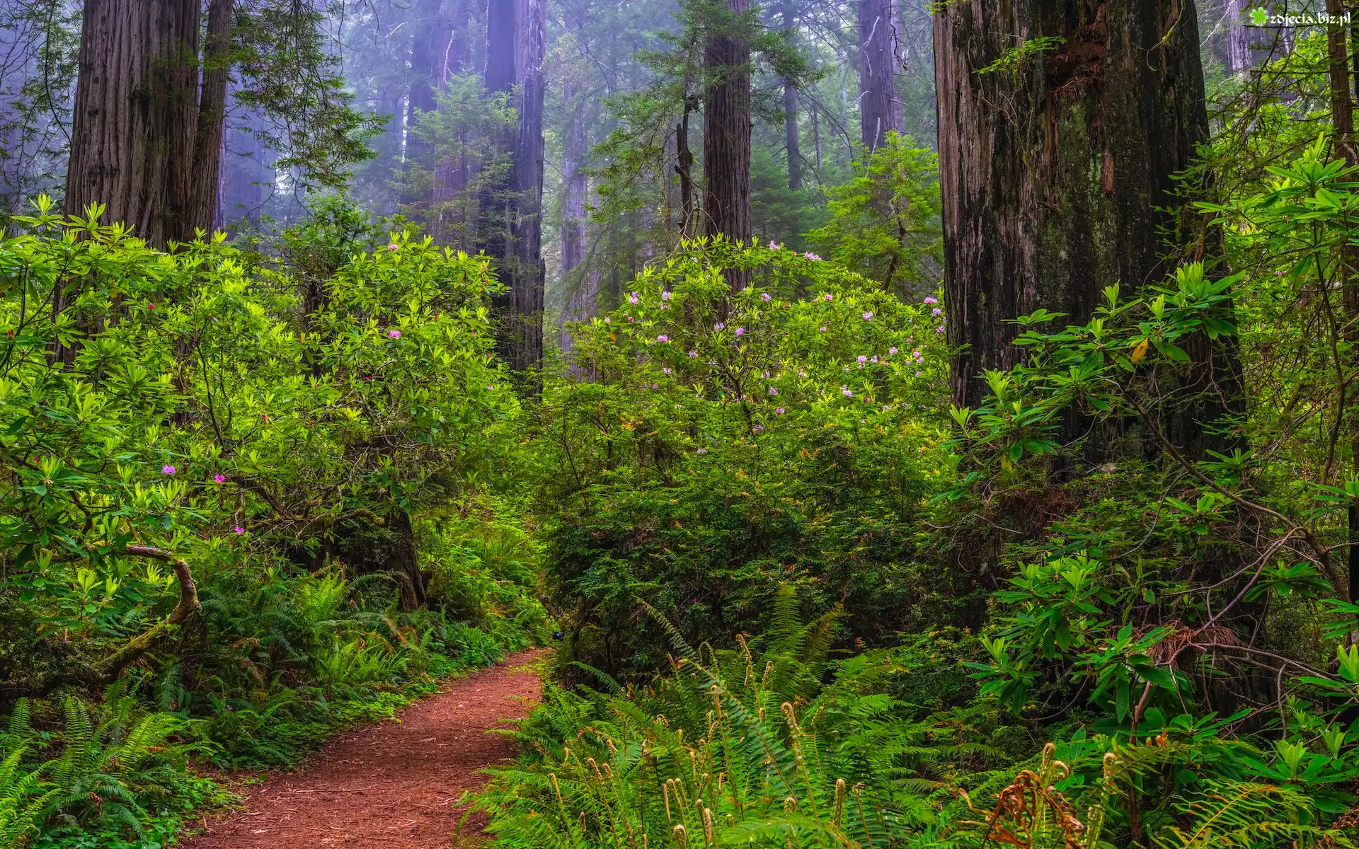 Zdjęcie Stany Zjednoczone, Kalifornia, Park Narodowy Redwood, Las, Sekwoje, Różaneczniki, Paprocie, Ścieżka |
