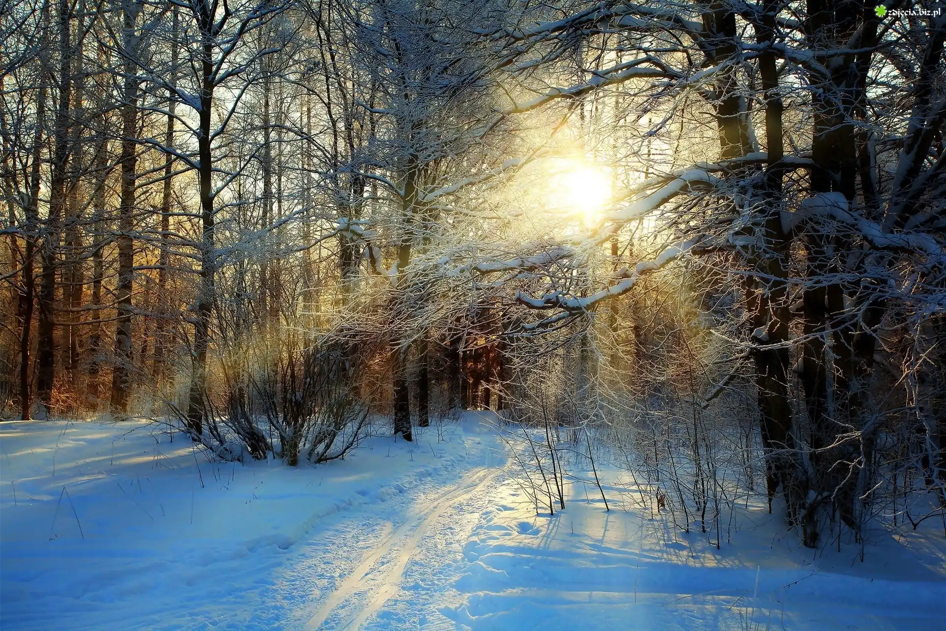 Zdjęcie Las, Drzewa, Ścieżka, Promienie, Słońca, Zima