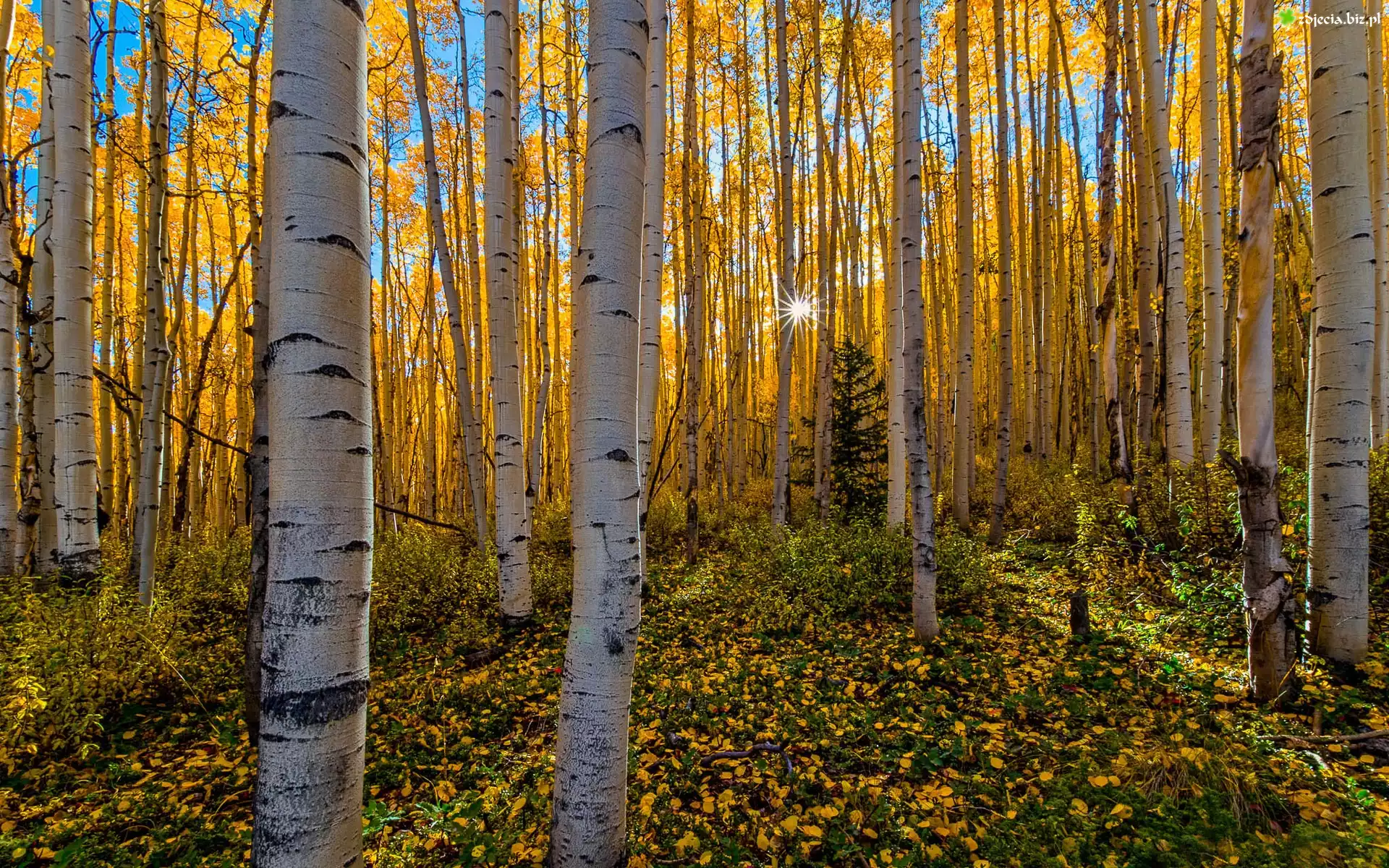 Zdjęcie Las, Brzozowy, Liście, Promienie, Słońca, Jesień