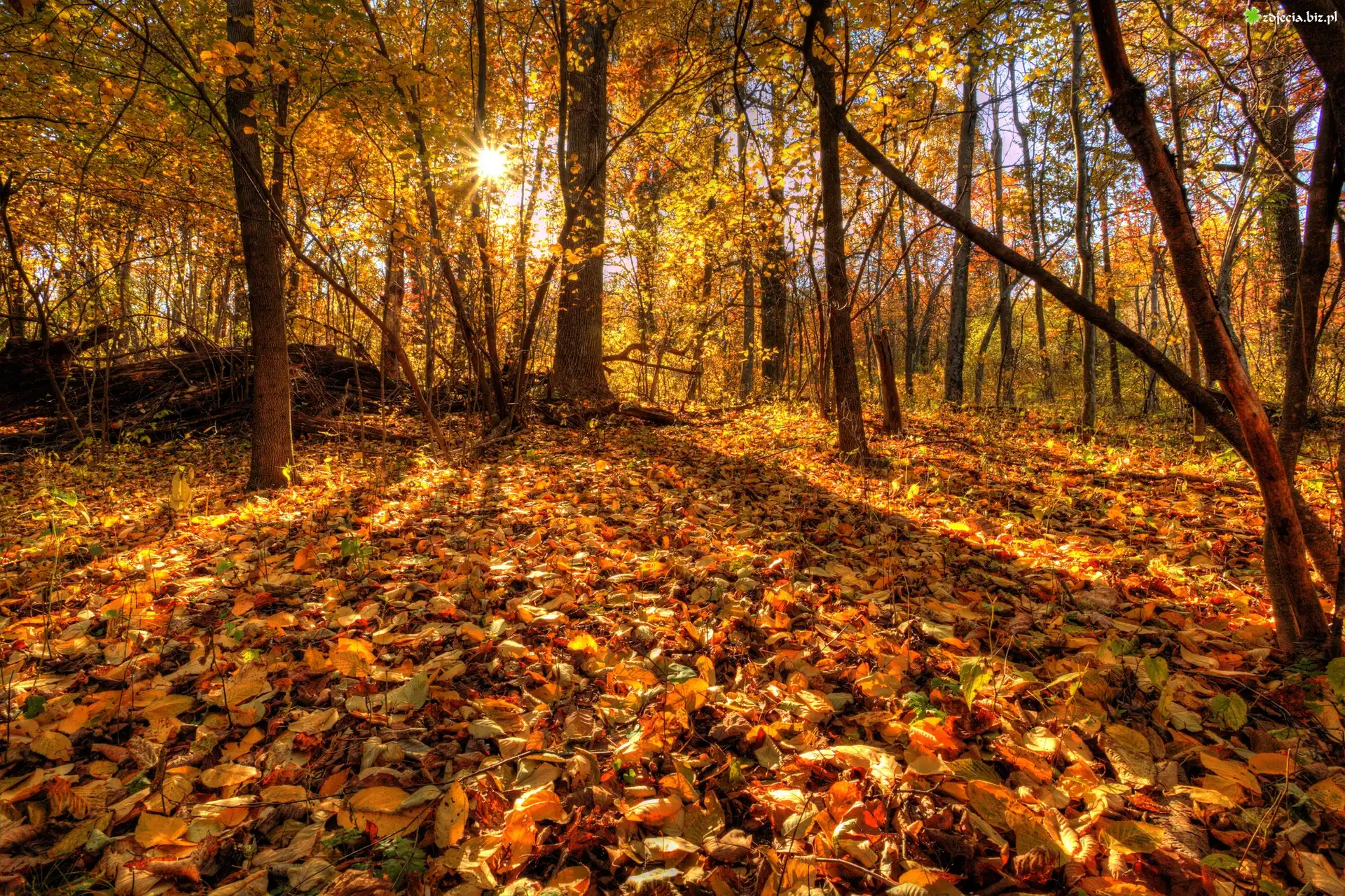 Zdjęcie Las, Liście, Promienie Słońca, Jesień