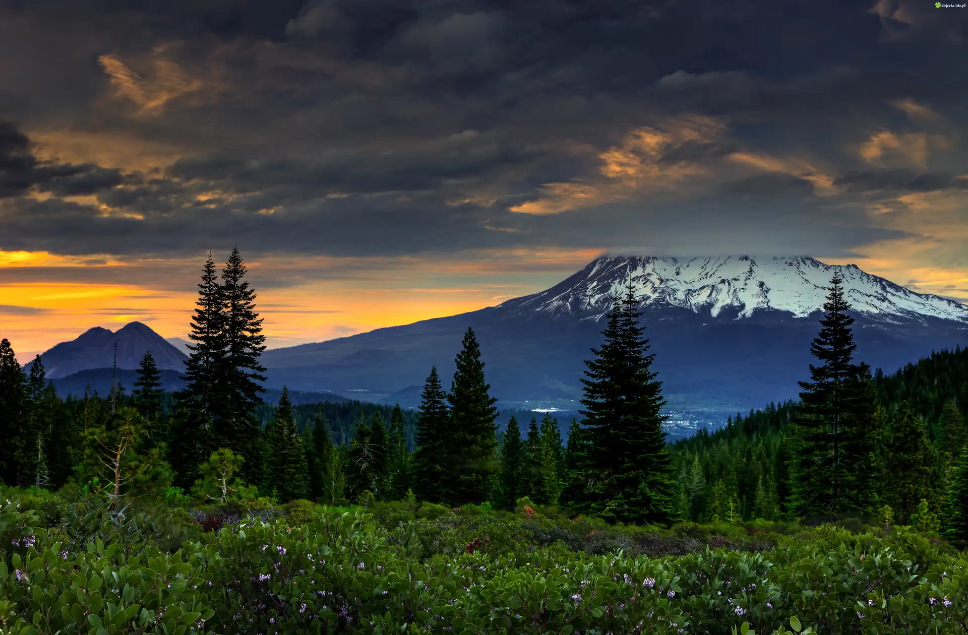 Zdjęcie, Las, Góry, Zachód Słońca, Kwiaty
