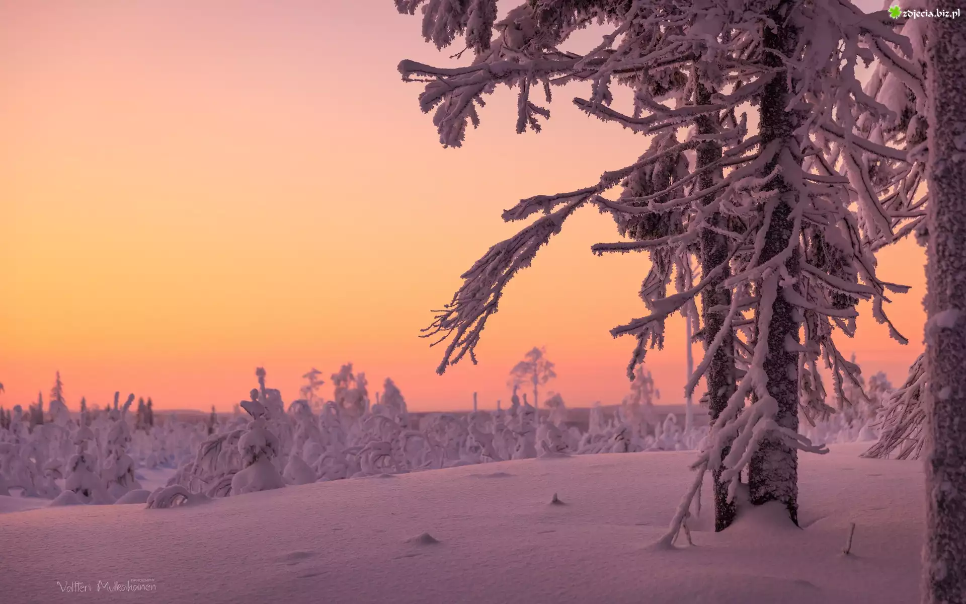 Zdjęcie Zima, Drzewa, Zaśnieżony, Las, Zachód słońca