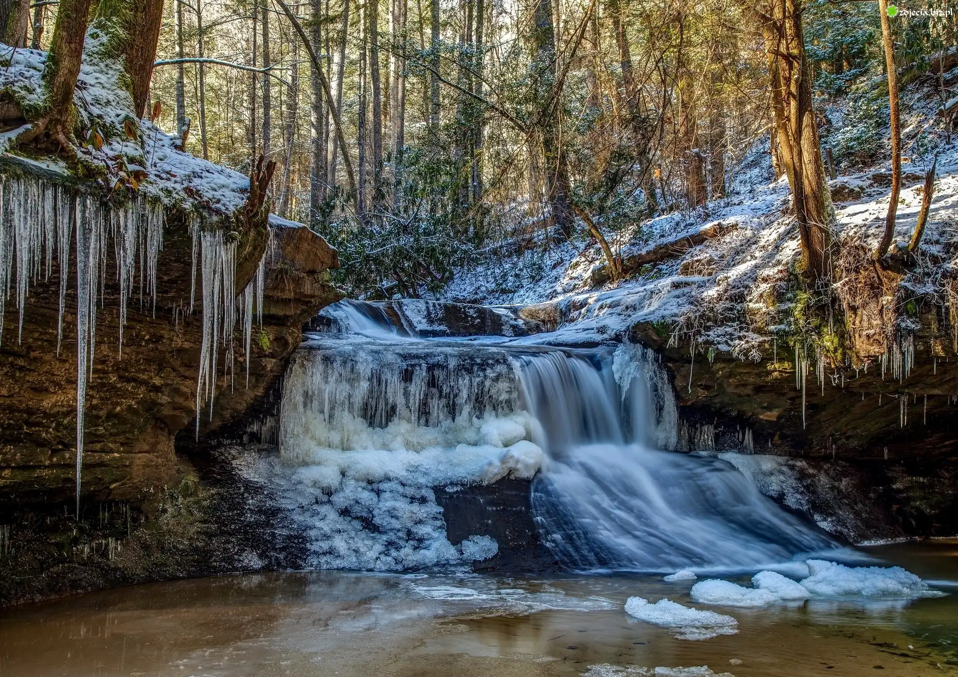 Zdjęcie Las, Wodospad, Sople, Lodu