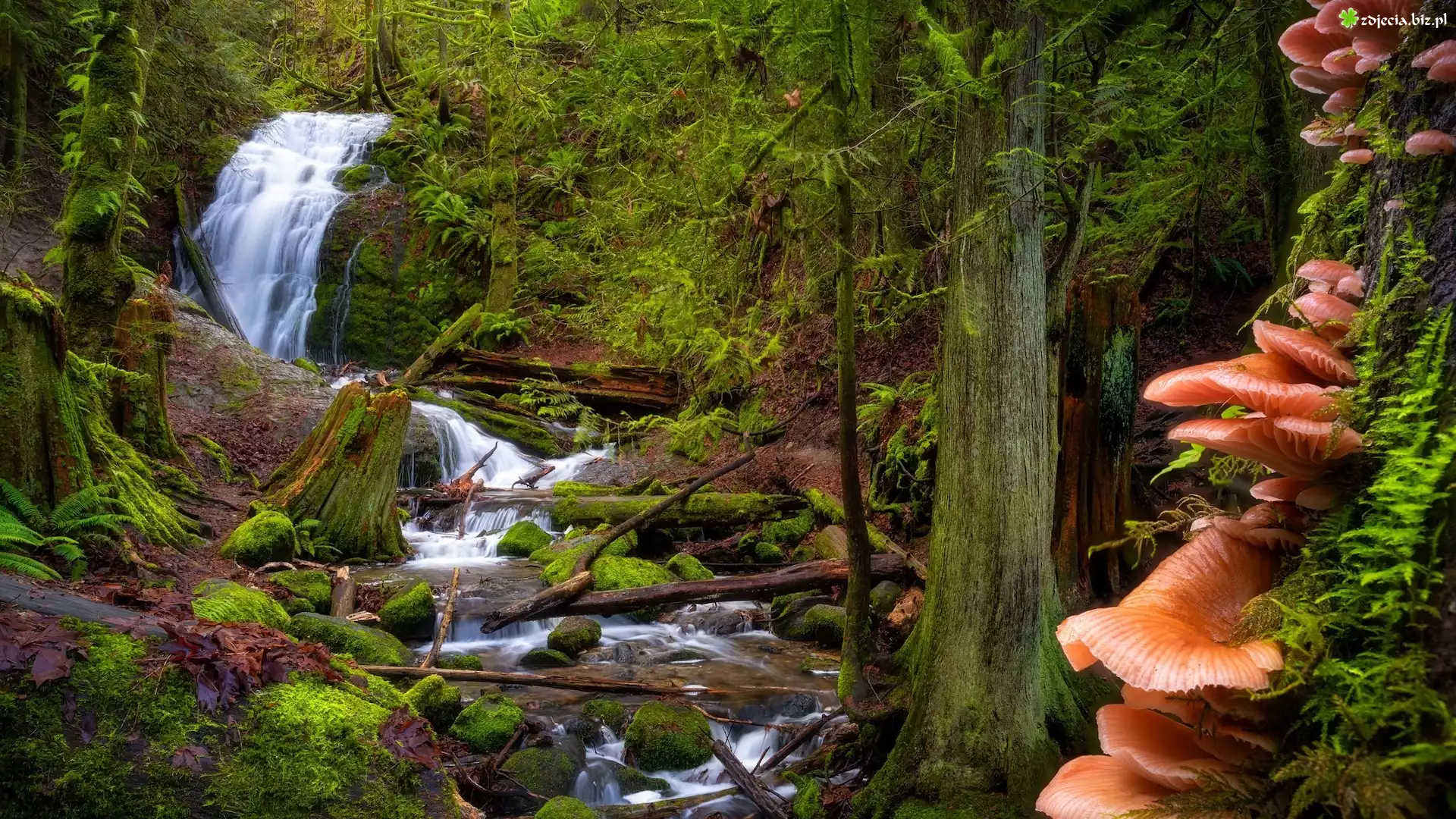 Zdjęcie Las, Wodospad, Coal Creek Falls, Rzeka, Drzewa, Powalone, Pnie, Omszałe, Kamienie, Grzyby, Stan Waszyngton, Stany Zjednoczone |