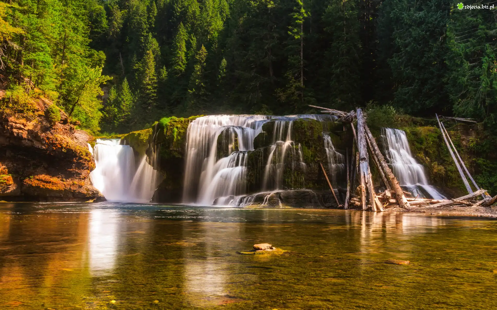 Zdjęcie Las, Drzewa, Wodospad Lower Lewis River Falls, Omszałe, Skały, Rzeka, Osada Cougar, Stan Waszyngton, Stany Zjednoczone |