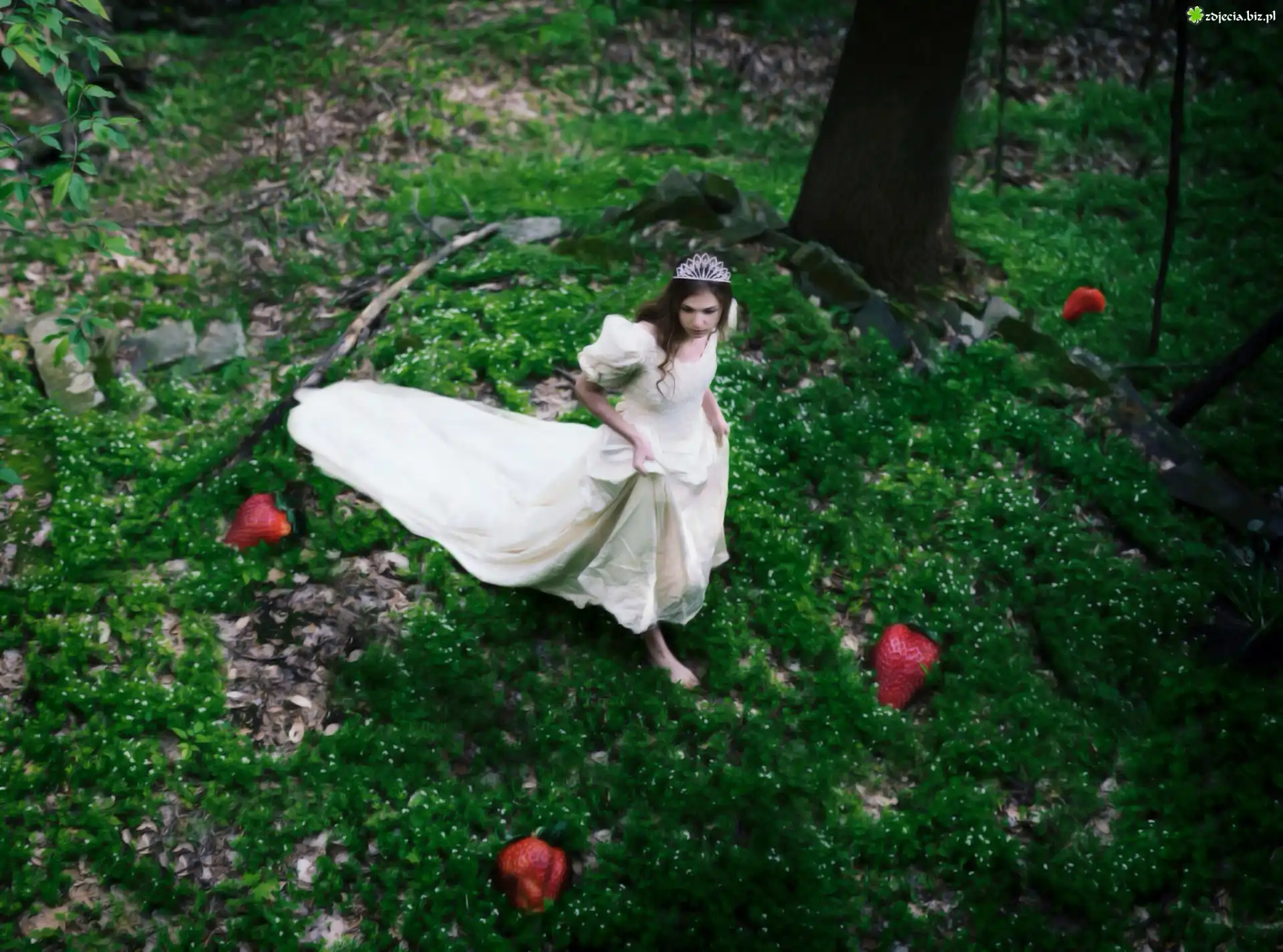 Zdjęcie, Kobieta, Biała, Suknia, Panna młoda, Truskawki, Las