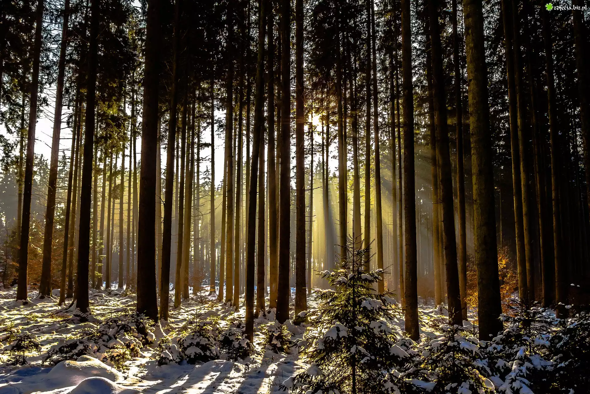 Zdjęcie Las, Drzewa, Przebijające światło, Zima