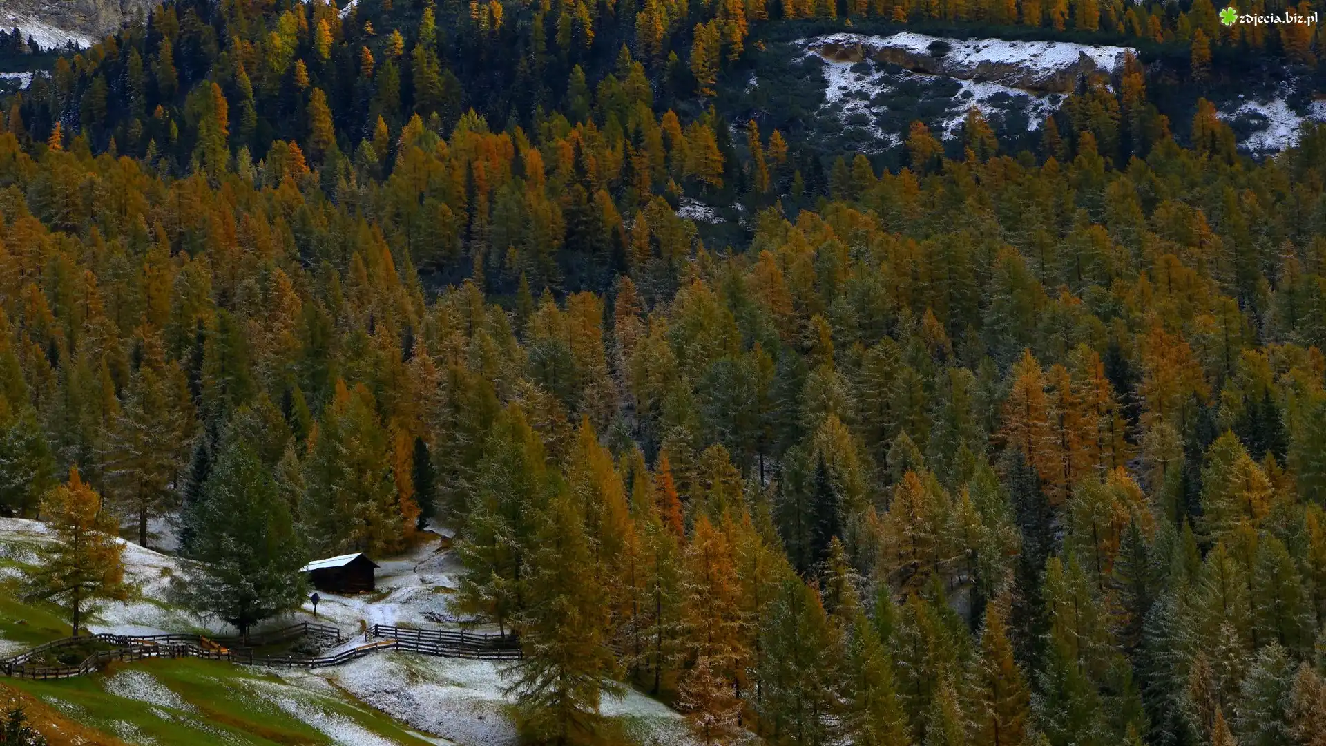 Zdjęcie Las, Drzewa, Śnieg, Szopa, Ogrodzenie