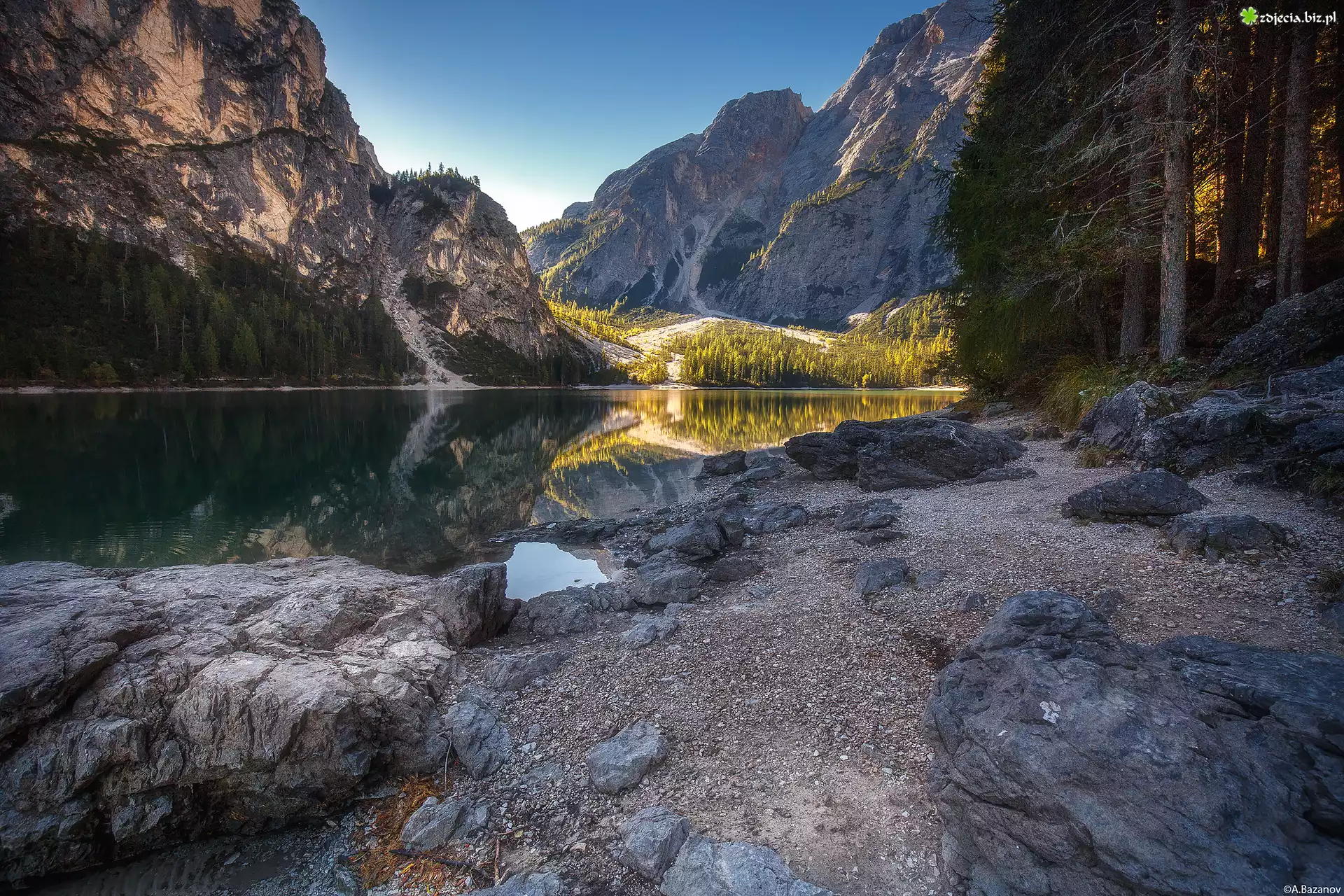 Zdjęcie, Włochy, Dolomity, Tyrol Południowy, Jezioro Pragser Wildsee, Góry, Las
