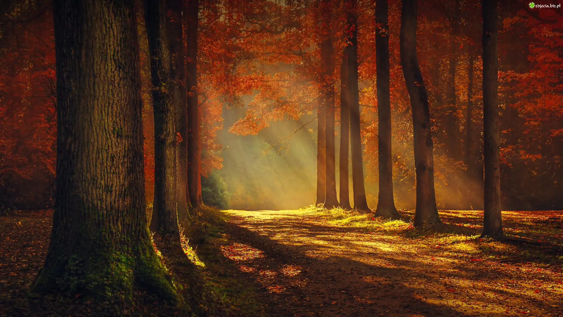Zdjęcie Jesień, Las, Drzewa, Promienie Słońca, Blask, Przebijające Światło