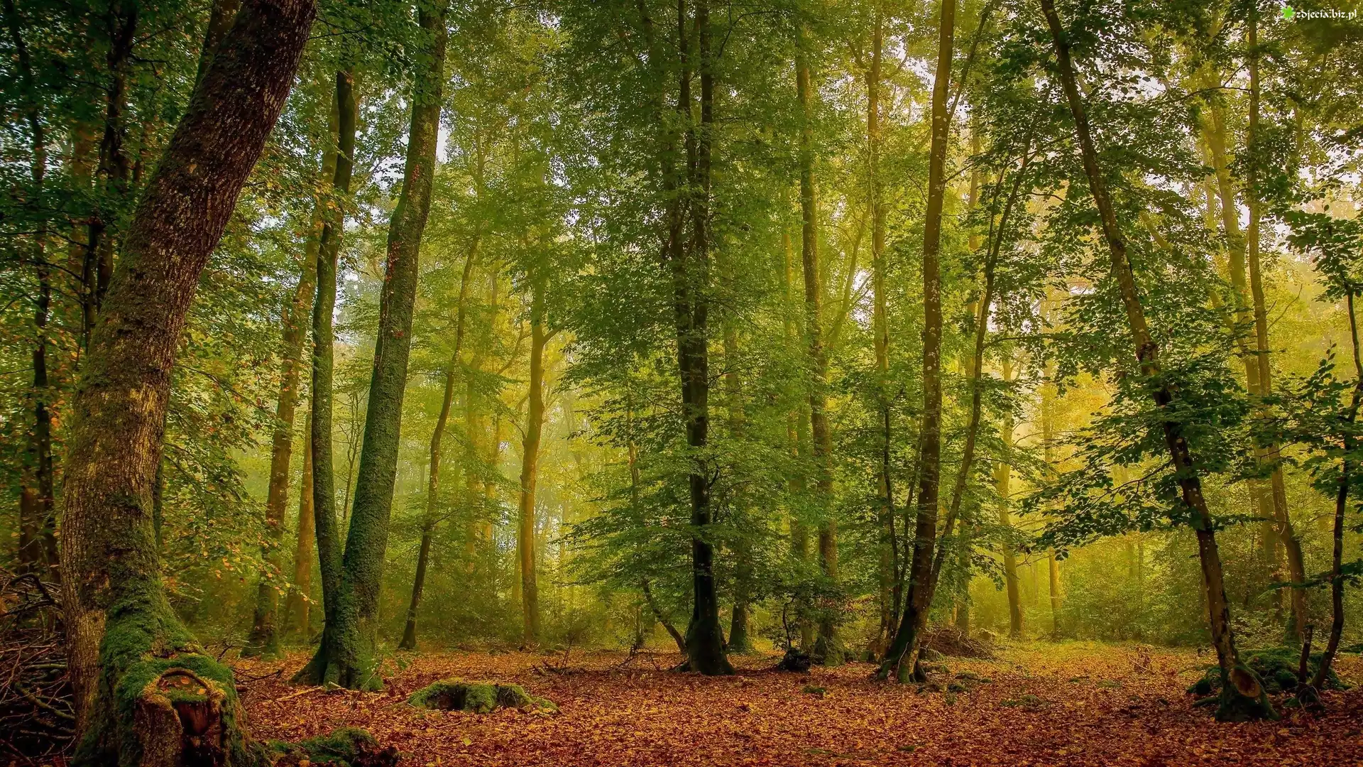Zdjęcie Las, Drzewa, Liście, Przebijające, Światło, Wiosna