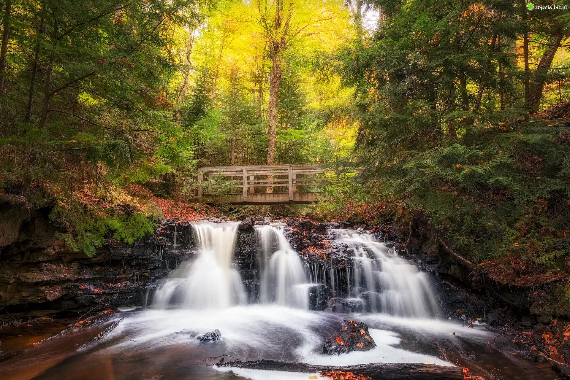 Zdjęcie Las, Wodospad Chapel Falls, Jesień, Mostek, Park Narodowy Pictured Rocks National Lakeshore, Miejscowość Munising, Stan Michigan, Stany Zjednoczone |