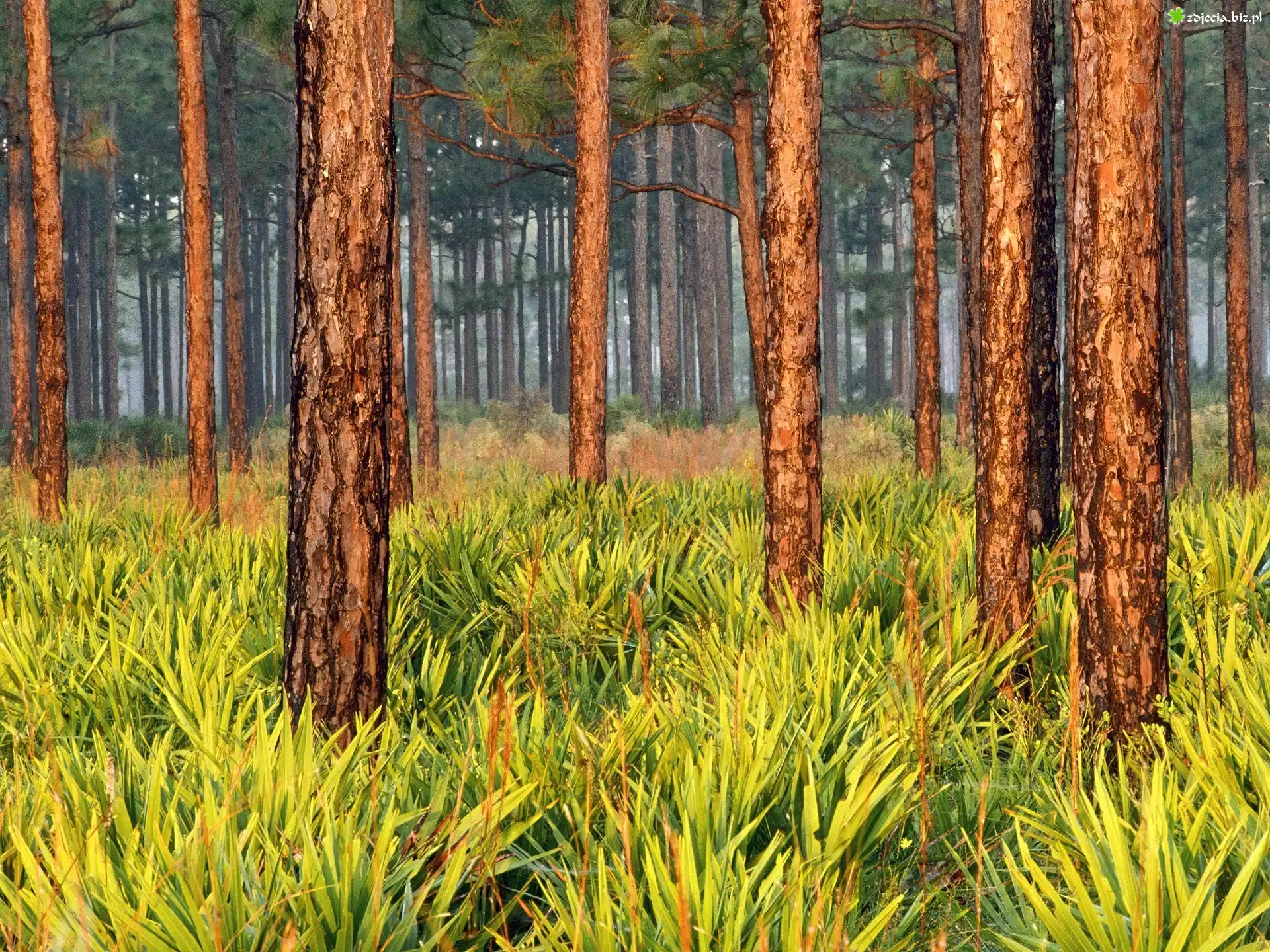 Zdjęcie Las, Wysokie, Drzewa, Żółto, Zielone, Krzewinki