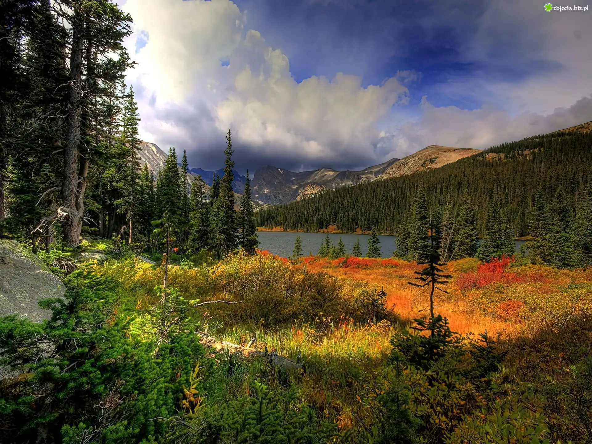 Zdjęcie Lasy, Drzewa, Chmury, Jezioro