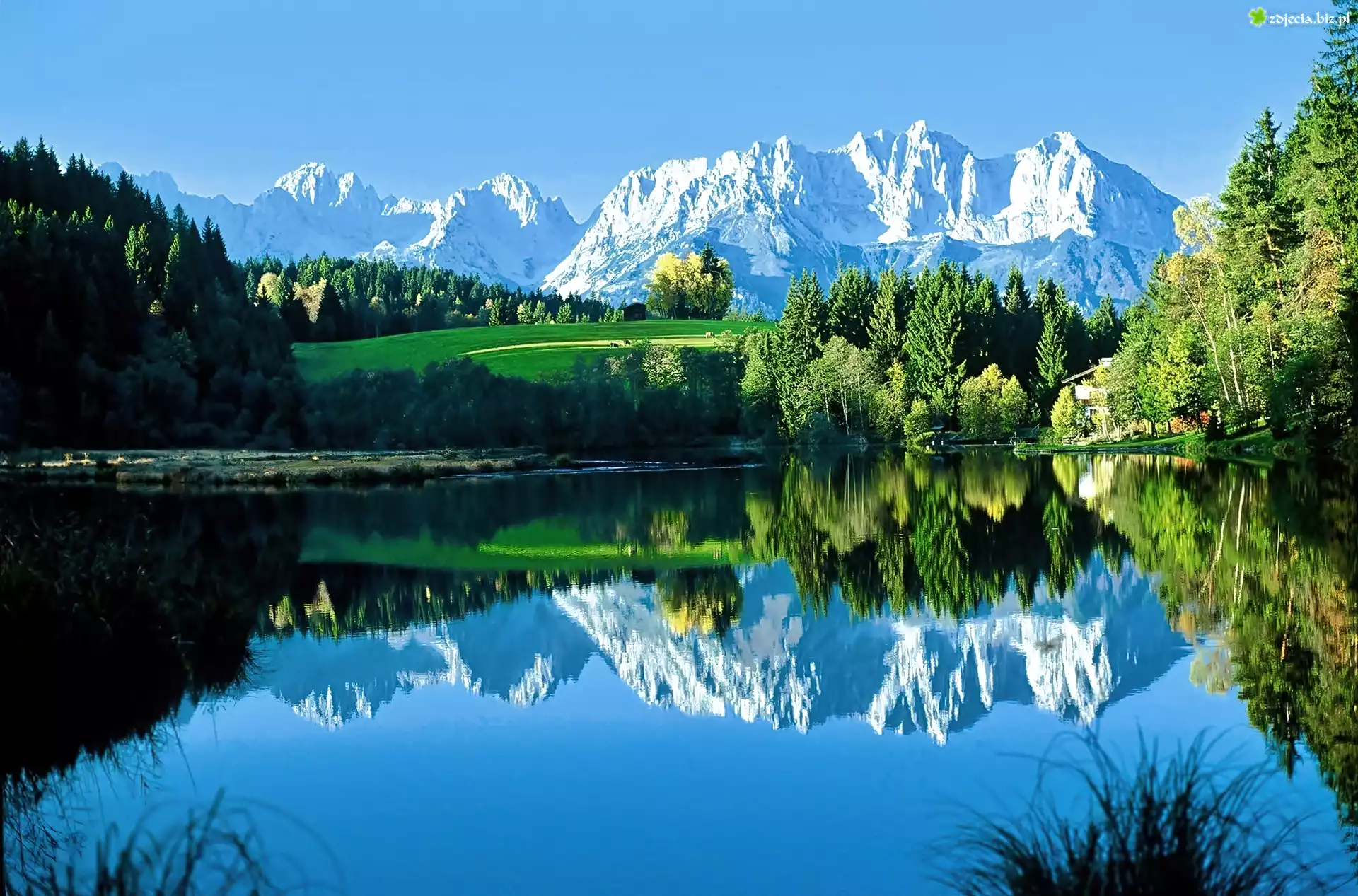 Zdjęcie Góry, Lasy, Łąki, Jezioro, Odbicie, Światło, Cień