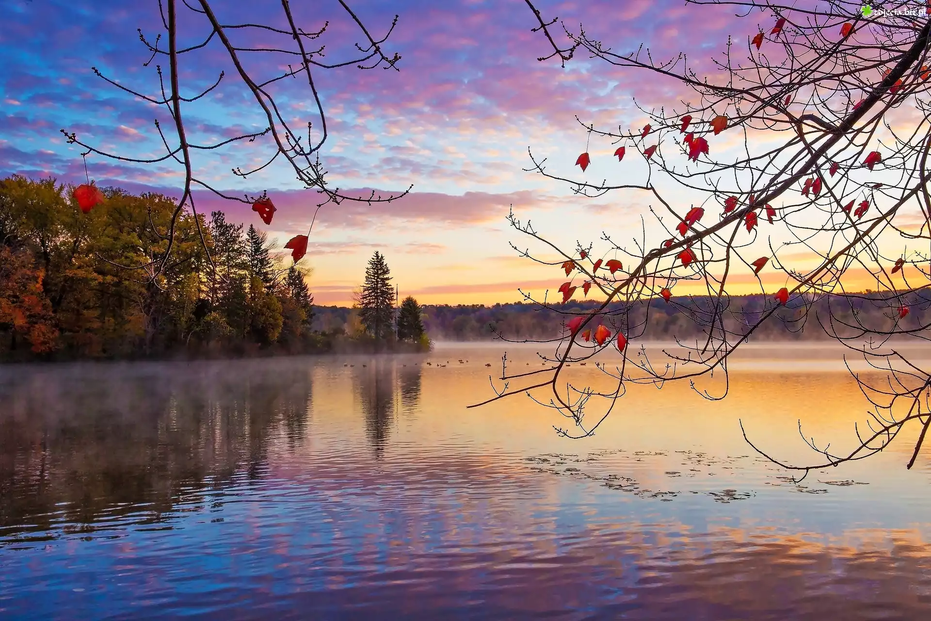 Zdjęcie, Jezioro, Lasy, Mgła, Kaczki, Wschód, Słońca, Jesień