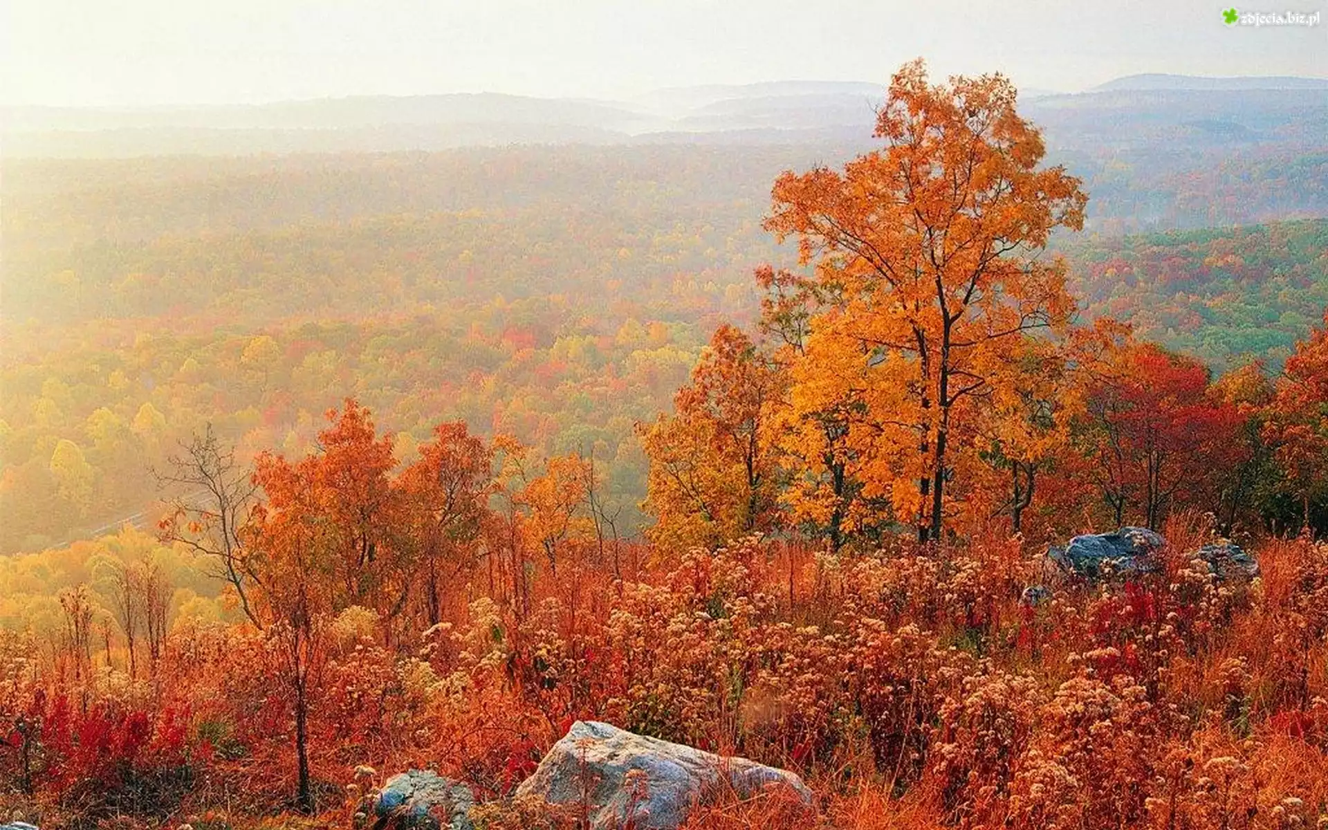 Zdjęcie Lasy, Kolorowe, Drzewa, Kamienie, Jesień