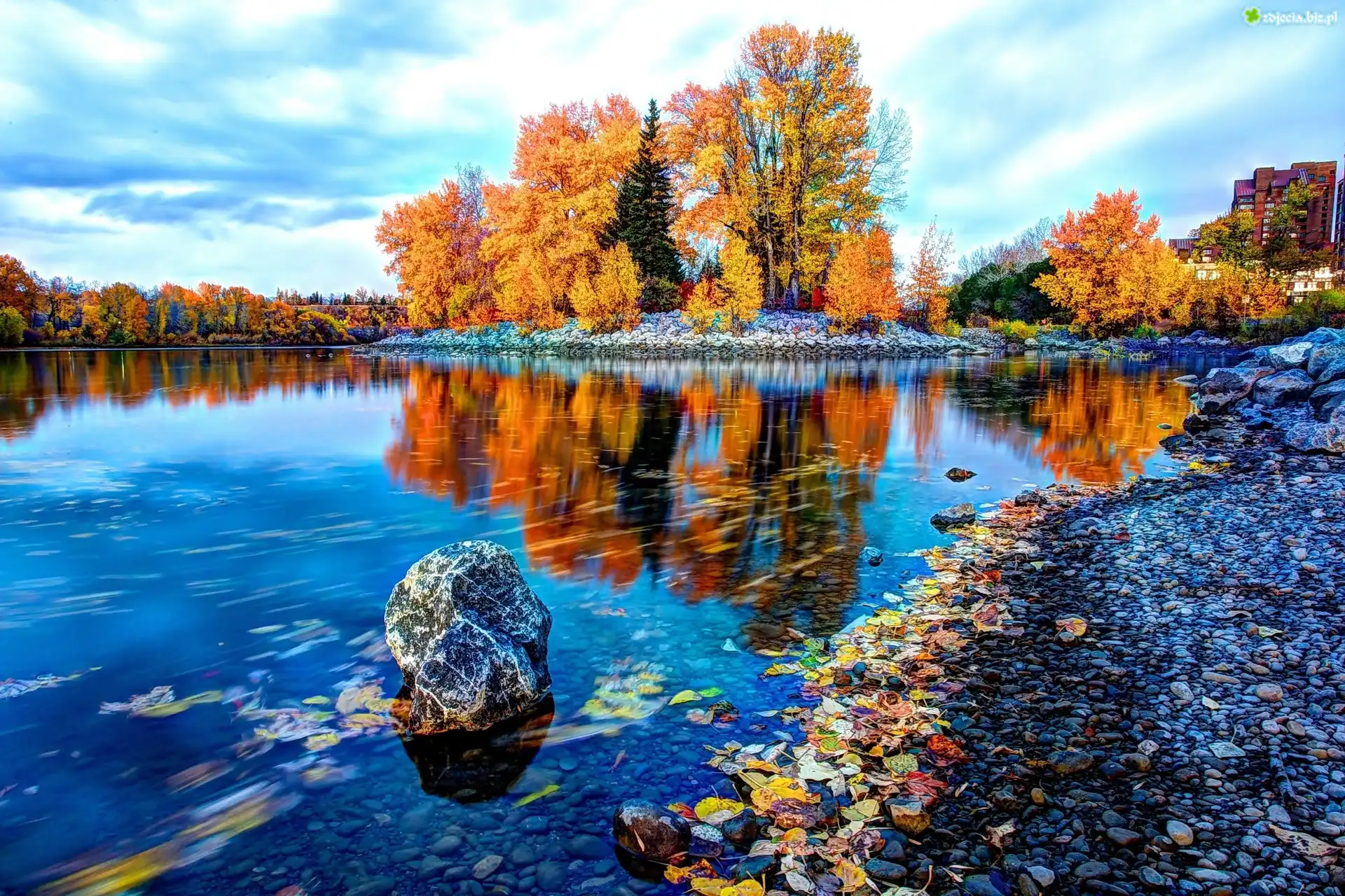Zdjęcie Rzeka, Lasy, Kamienie, Liście, Jesień, Prowincja, Alberta, Kanada
