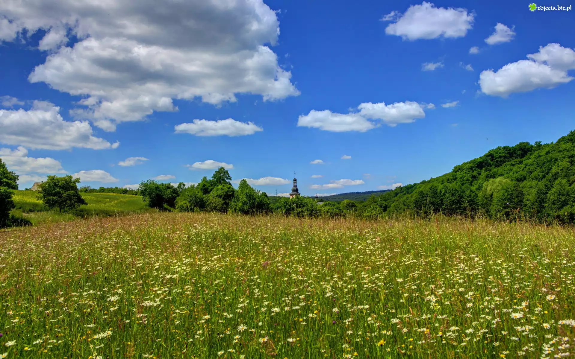 Zdjęcie Łąka, Kwiaty, Kościółek, Lasy, Chmury