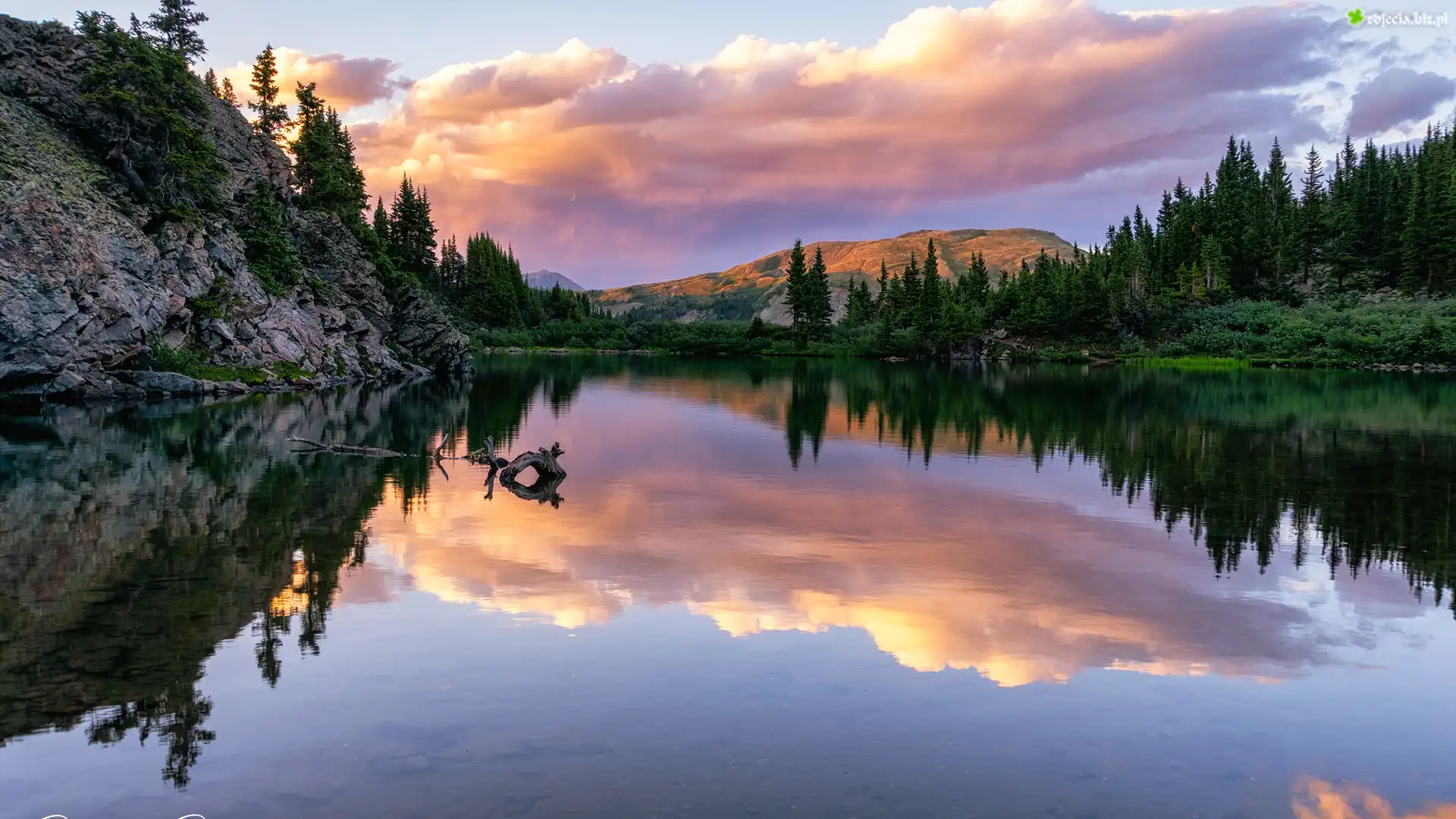 Zdjęcie Jezioro, Lost Lake, Przełęcz Cottonwood, Skały, Drzewa, Lasy, Odbicie, Góra, Zachód słońca, Kolorado, Stany Zjednoczone |