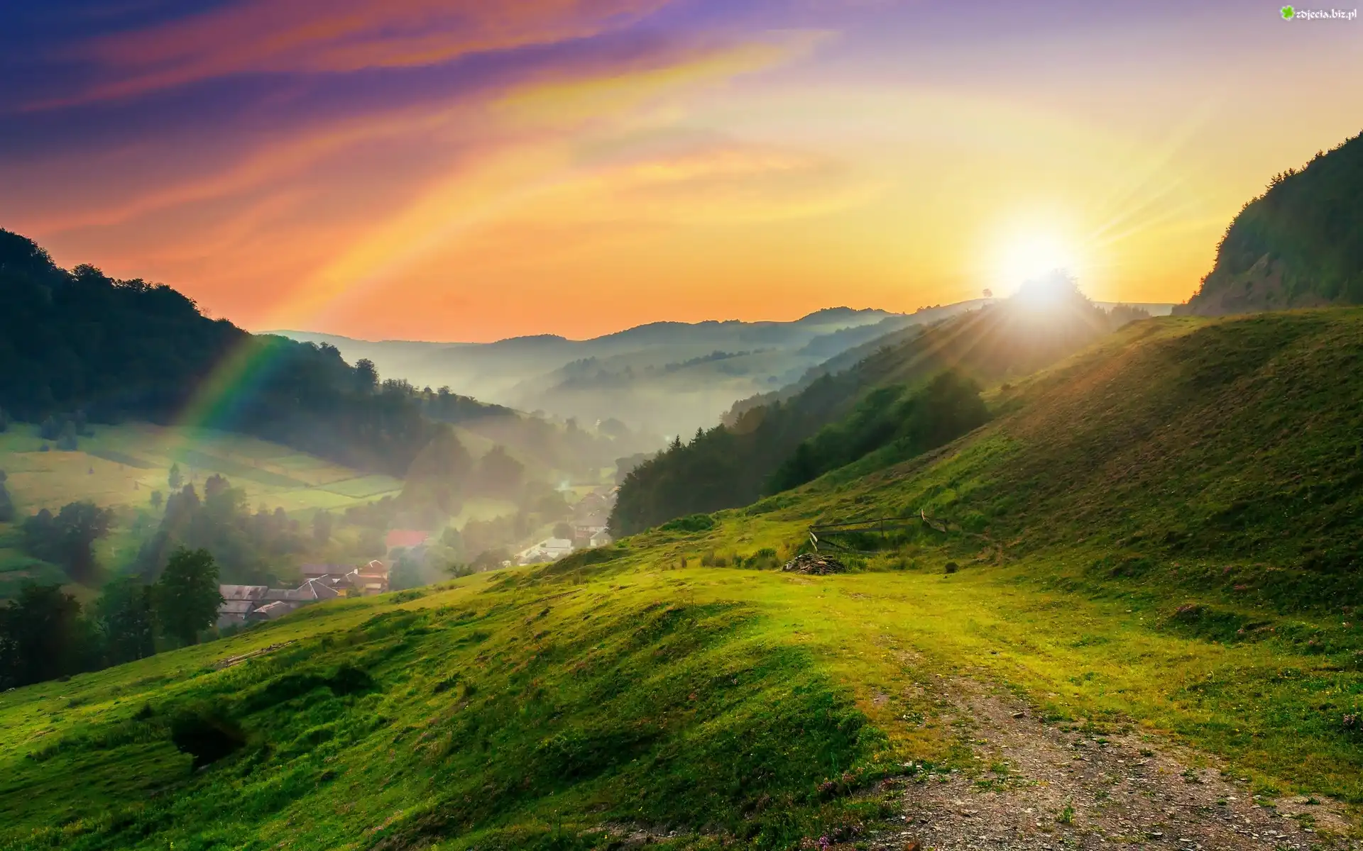 Zdjęcie Góry, Lasy, Łąki, Miasteczko, Mgła, Tęcza, Promienie, Słońca